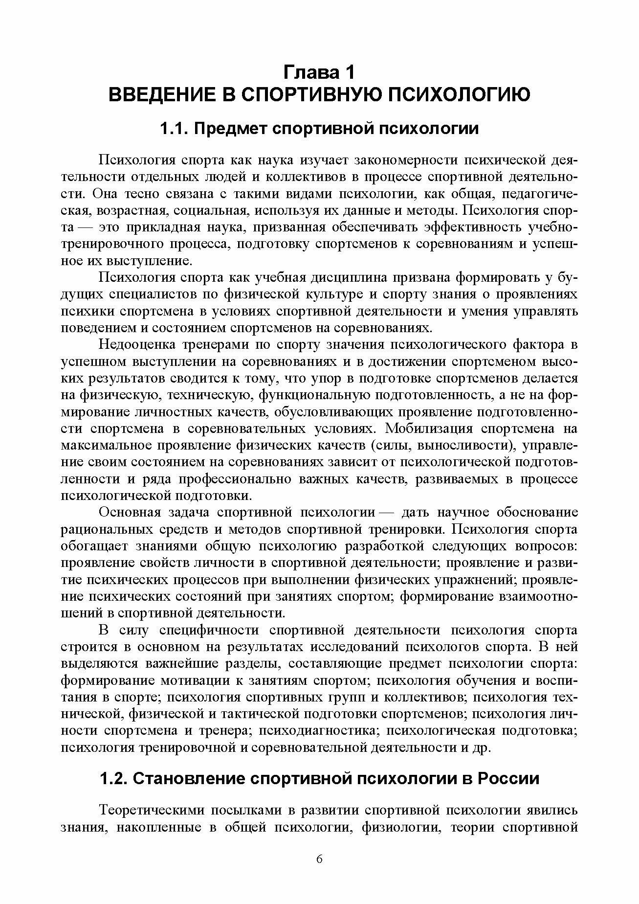 Учебник включает две части: общая психология, спортивная психология. В первой части приводятся история и теории психологии, характеристика психических процессов, свойств, состояний и взаимоотношений. Во второй части представлены сведения о проявлении психики в процессе занятий спортом. Приводится история возникновения и становления психологии спорта в России, современное состояние научного психологического знания и его значение в подготовке тренеров по спорту и спортсменов. Представлены современные научные сведения об общей и спортивной психологии как учебной и научной дисциплине, расширяющие психолого-педагогический кругозор будущих специалистов по физической культуре и спорту.