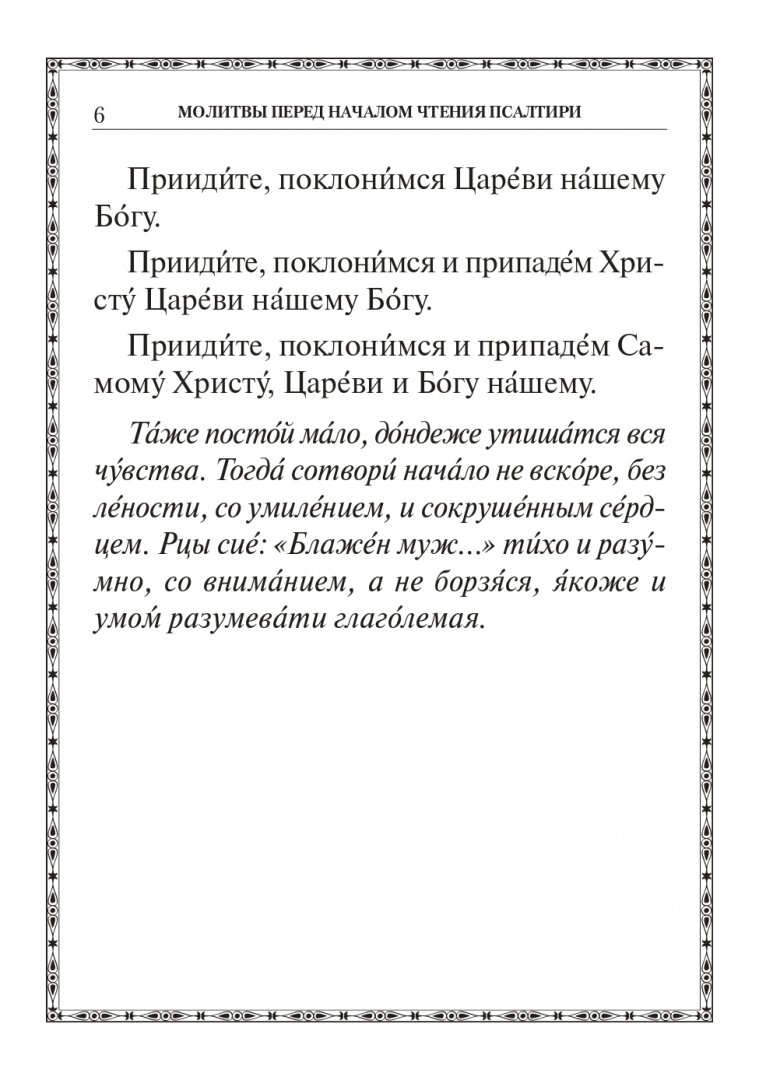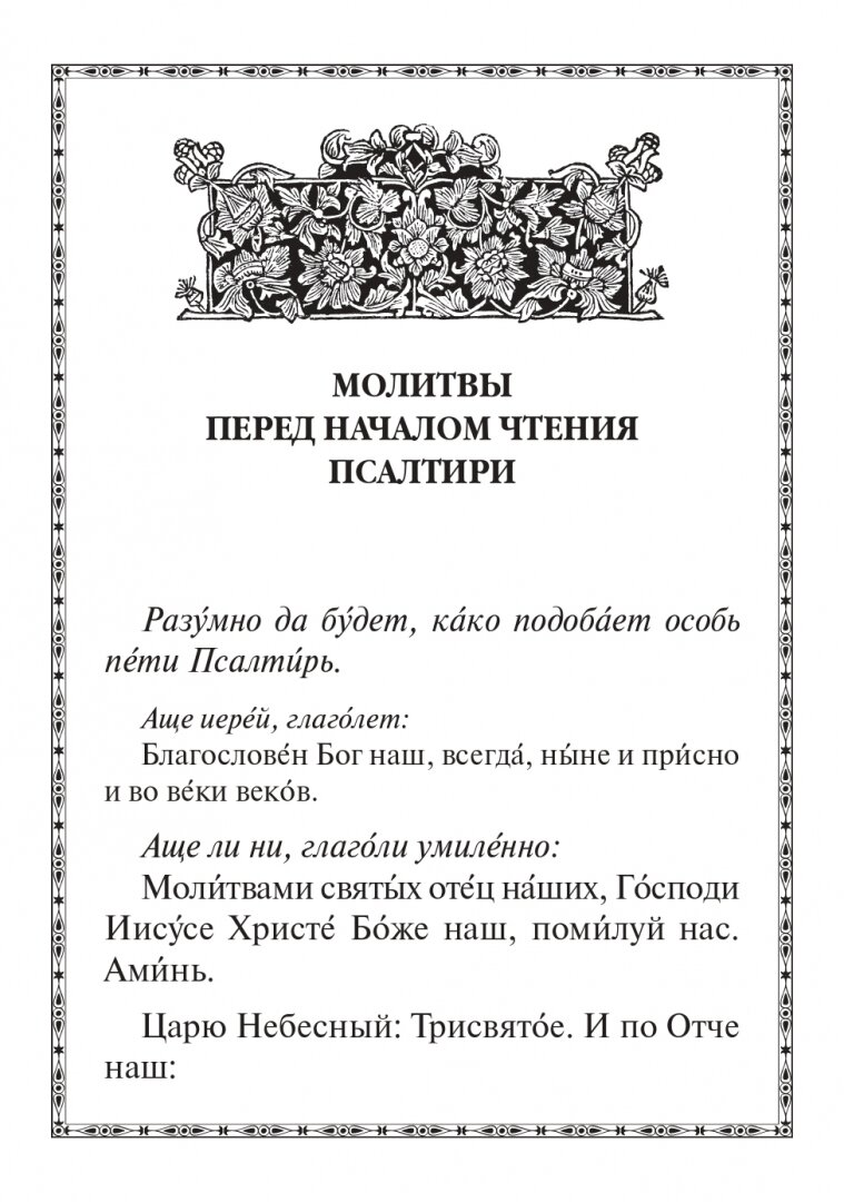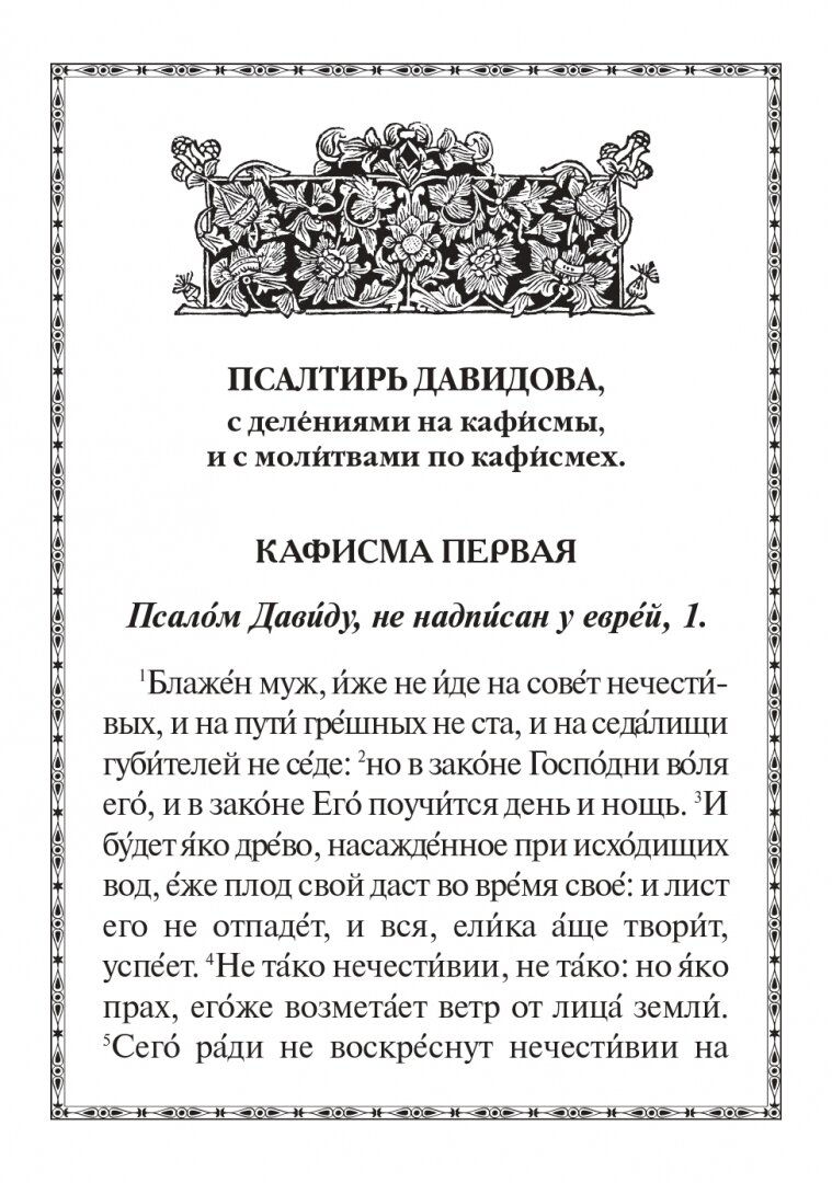 Псалтирь — это молитвослов Иисуса Христа. В Своей земной жизни Господь молился вместе с учениками словами псалмов пророка и царя Давида. Псалтирь неиссякаемый источник духовных жемчужин, одна из книг Ветхого Завета, написанная за тысячу лет до Рождества Христова. Вместе с учением благочестия Псалтирь содержит пророчества о Христе Спасителе: Его предвечном бытии, вочеловечении, страданиях, искупительной смерти.