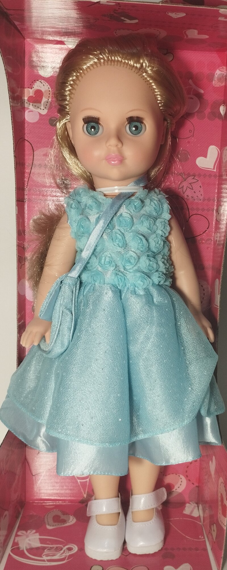 У прелестной куклы Милы от фабрики Весна прелестные голубые глаза, которые могут закрываться, и роскошные золотистые волосы. На ней надето нарядное голубое платье и белые туфельки. К наряду подобрана тканевая сумочка в тон.