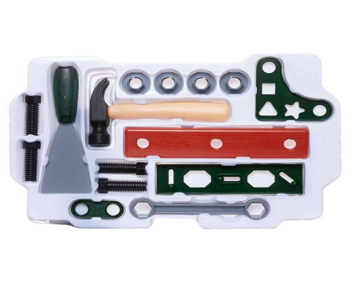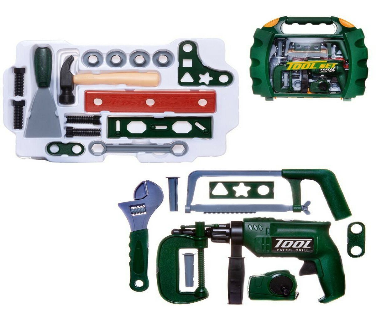 ABtoys Помогаю папе Набор инструментов в чемоданчике (22 предмета) PT-00569 Инструменты в наборе "Помогаю папе" в чемодане Игровой набор инструментов из серии "Помогаю Папе"- необходимый элемент в игровой комнате каждого мальчика. Игрушки с ранних лет научат малыша первичным навыкам работы с инструментами. Все инструменты изготовлены из качественного пластика, поэтому абсолютно безопасны для игры. Мальчик сможет наблюдать за папой и повторять все его действия, но уже с помощью своего набора "Помогаю папе". Комплектация (22 предмета): брусок, шпатель, торцевой ключ, молоток с гвоздодером, ножовка, дрель, рулетка, лекало 3 шт., струбцина, гайка 4 шт., разводной ключ, дюбель 2 шт., болт 3 шт., уровень.