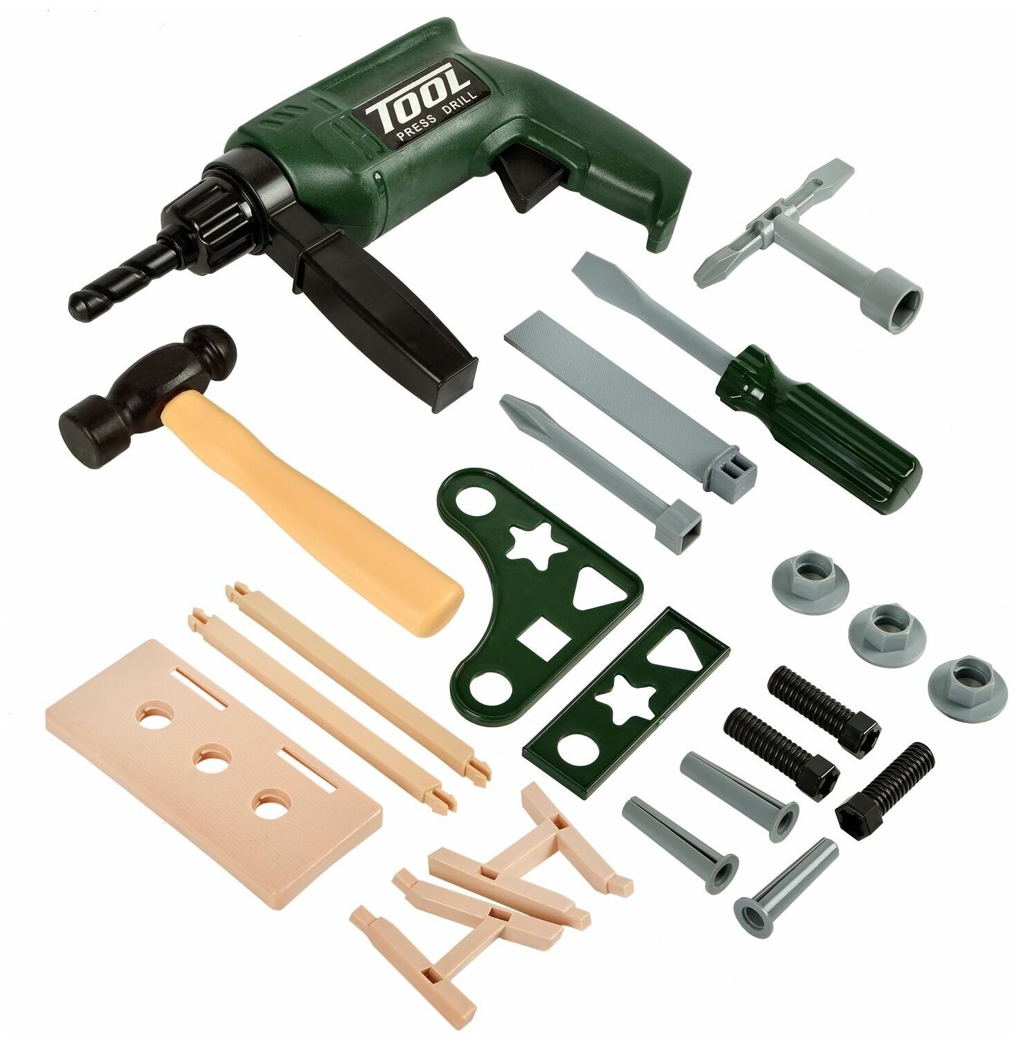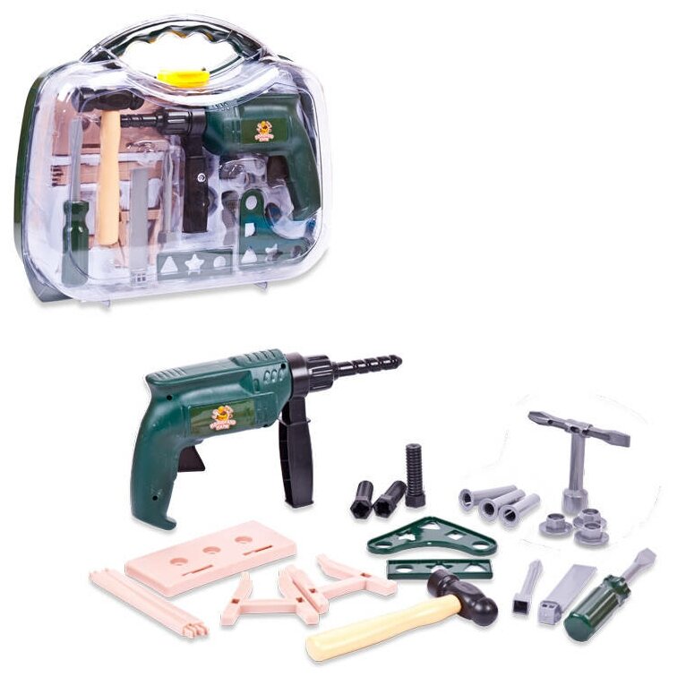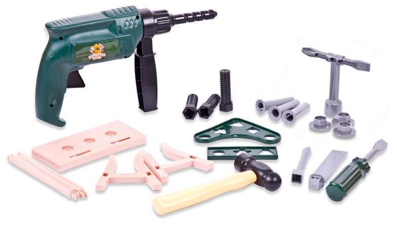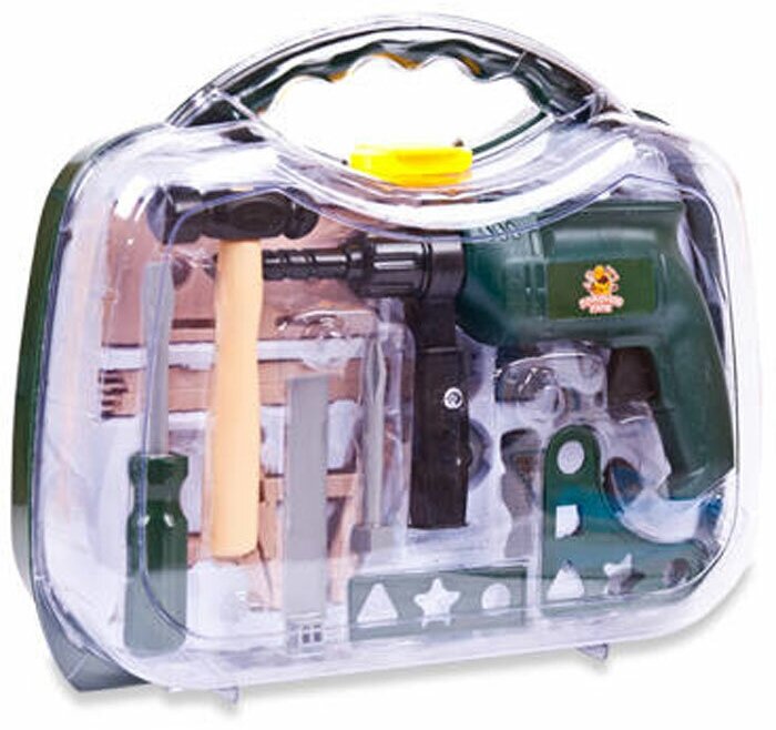 ABtoys Помогаю папе Набор инструментов в чемоданчике (22 предмета) Игровой набор инструментов из серии "Помогаю Папе" - необходимый элемент в игровой комнате каждого мальчика. Игрушки с ранних лет научат малыша первичным навыкам работы с инструментами. Все инструменты изготовлены из качественного пластика, поэтому абсолютно безопасны для игры. Мальчик сможет наблюдать за папой и повторять все его действия, но уже с помощью своего набора "Помогаю папе". Комплектация (22 предмета): верстак (в наборе 5 деталей), напильник, дрель, шлицевая отвертка со сменной насадкой, торцевой ключ, лекало 2 шт., крестообразная отвертка, молоток, гайка 3 шт., дюбель 3 шт., болт 3 шт.