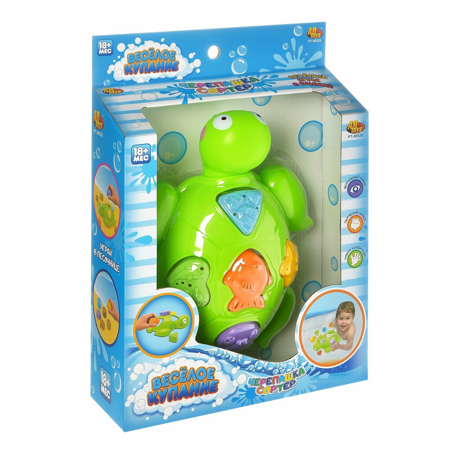 ABtoys Веселое купание Черепашка с аксессуарами (5 предметов) Игрушка улучшает процесс восприятия детьми цветов и форм, а так же познавательные способности и память малыша, развивает визуальные, творческие навыки и навык координации. Особенности: Черепашка сортер, 5-ть формочек пластиковых для ванной. Размер упаковки (д/ш/в): 36x26,5x9,5 см. Формочки вставляются в черепашку.