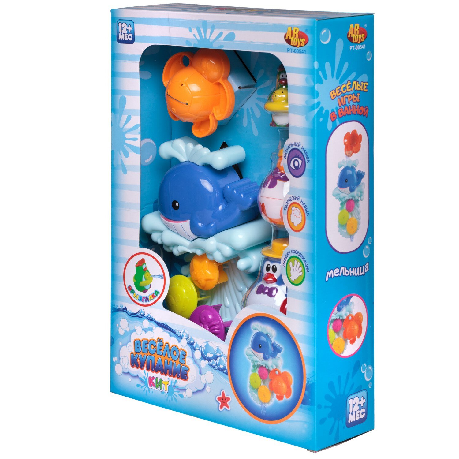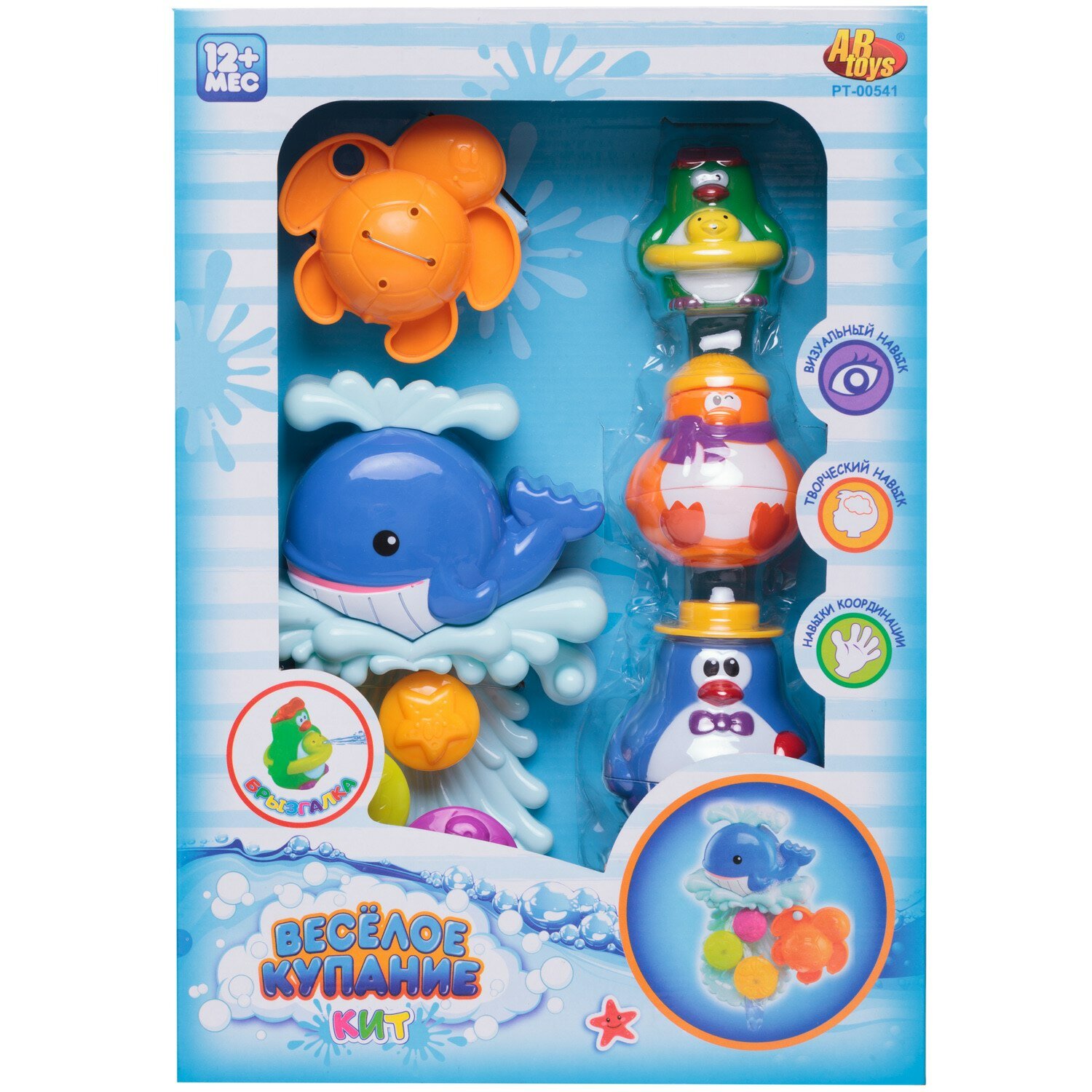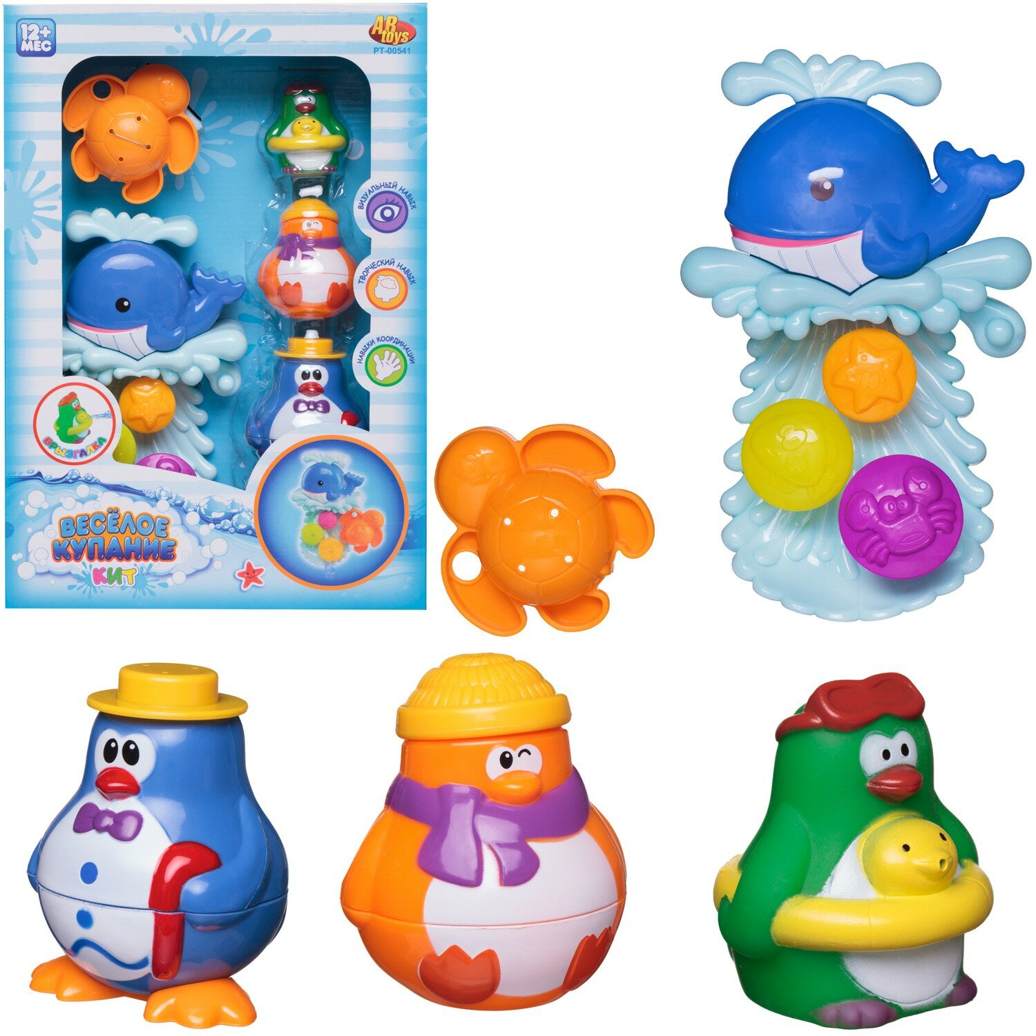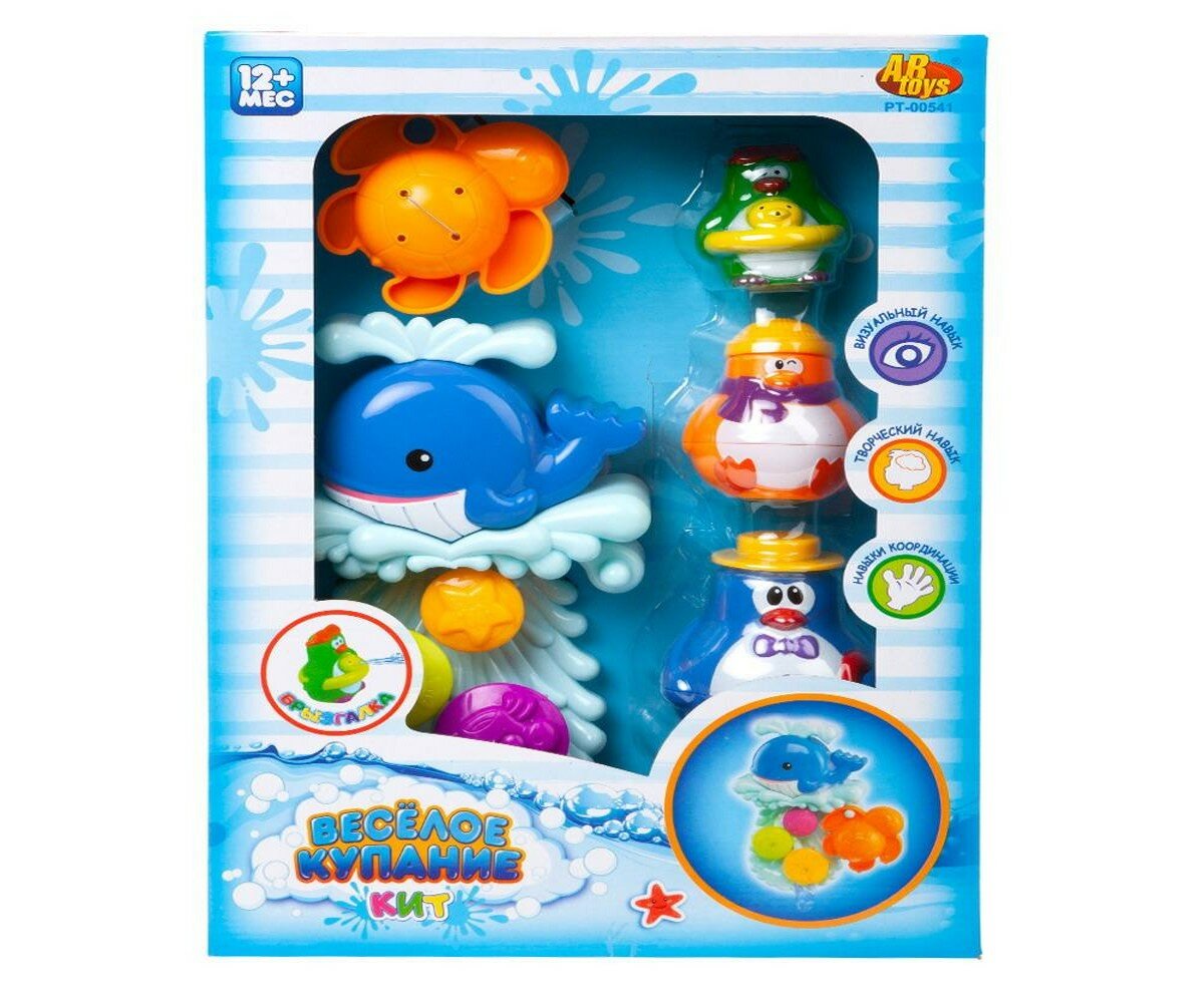ABtoys Игрушки для ванной Веселое купание в наборе с аксессуарами (5 предметов) Пластиковые игрушки для ванной, в коробке. Игрушки для ванной Веселое купание. Развивает визуальный и творческий навыки, и навыки координации, кит крепится к любой ровной поверхности. Комплектация: пингвин складывающийся 3 шт. кит с вращающейся мельницей черепашка Для работы батарейки не требуются.