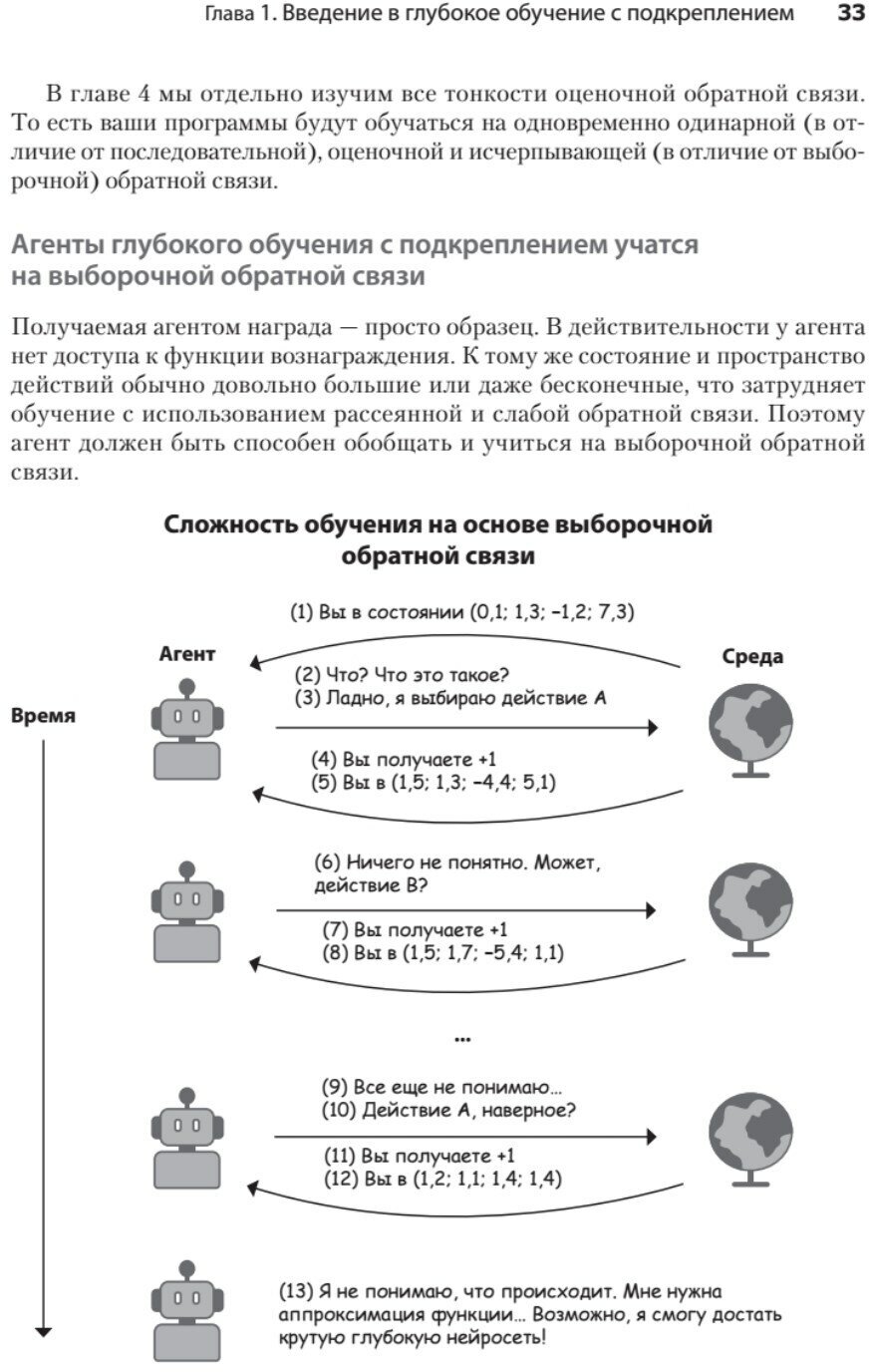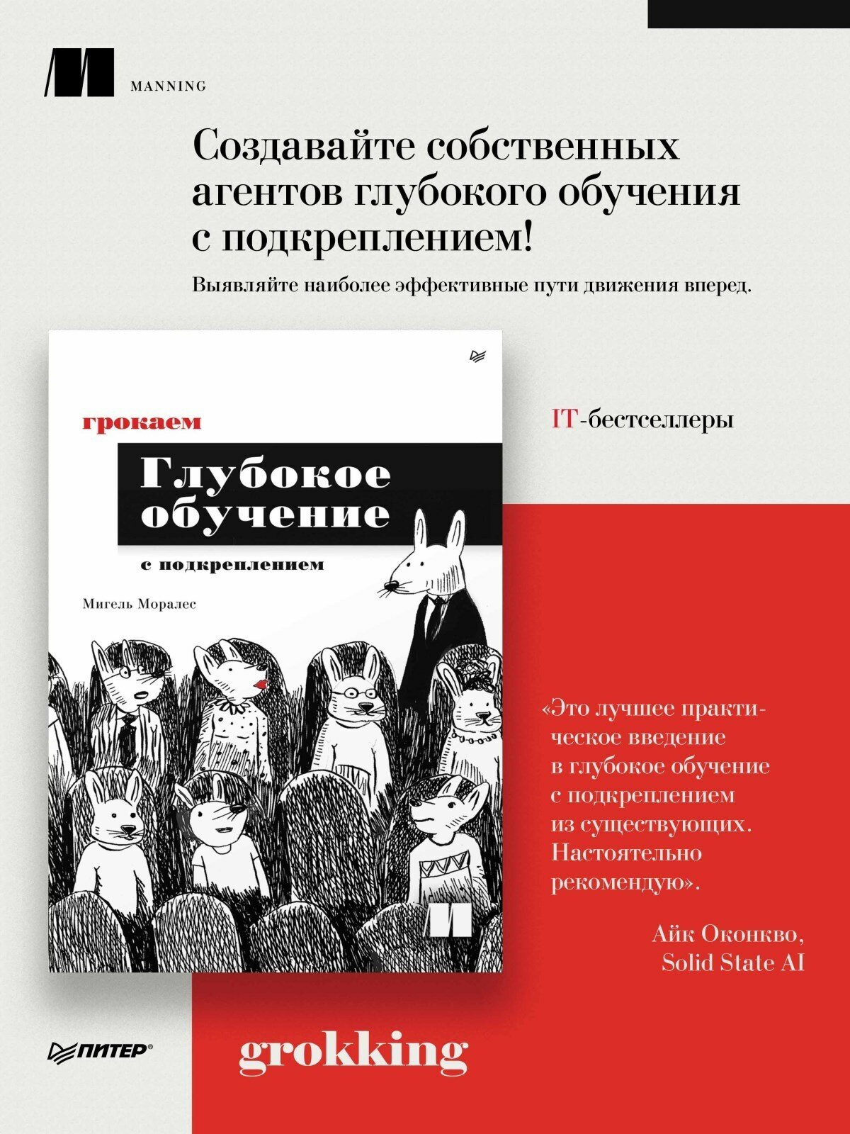 Давайте научимся создавать системы глубокого обучения на примере увлекательных упражнений, сопровождаемых кодом на Python с подробными комментариями и понятными объяснениями. Вы увидите, как работают алгоритмы, и научитесь создавать собственных агентов глубокого обучения с подкреплением, используя оценочную обратную связь.