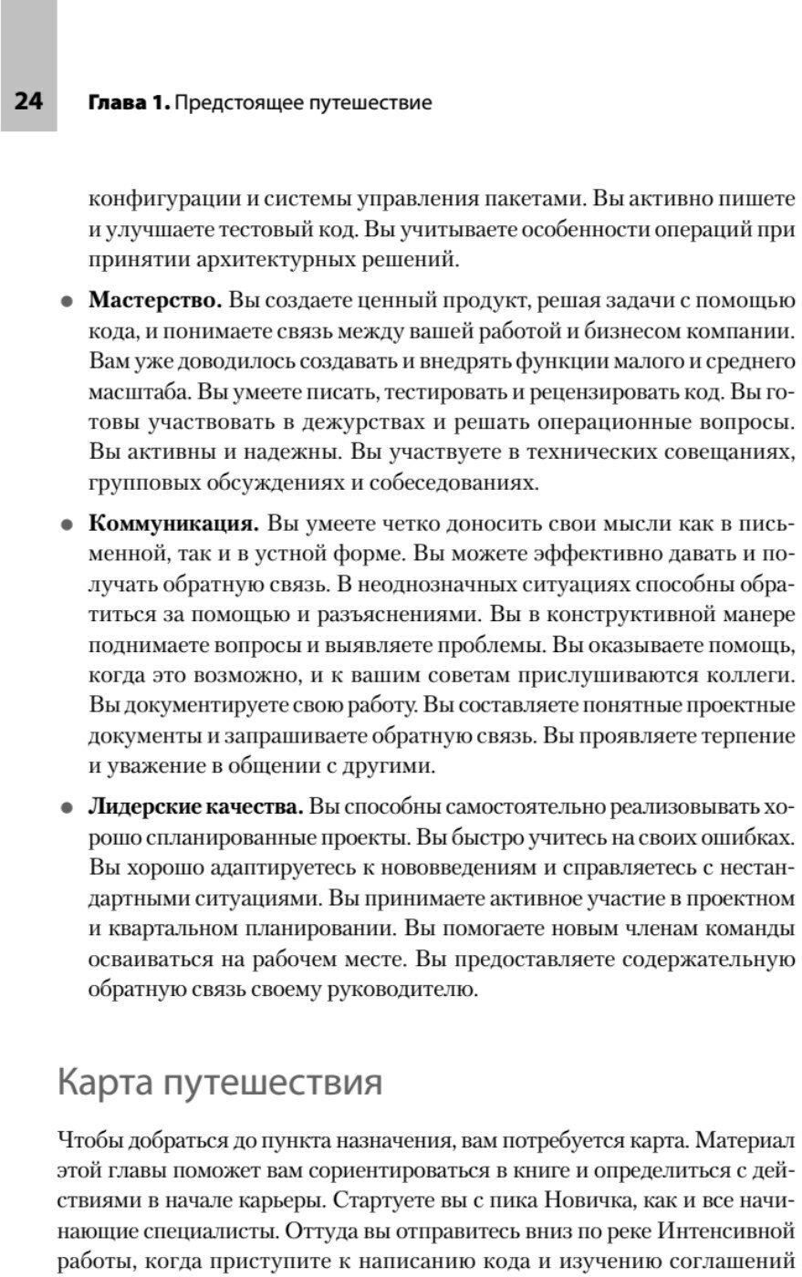 Вы узнаете о том, что вас ждет при устройстве на работу, затем познакомитесь с особенностями кода промышленного уровня, эффективным тестированием, рецензированием кода, непрерывной интеграцией и развертыванием, созданием проектной документации и лучшими практиками архитектуры ПО. В последних главах описываются навыки гибкого планирования и даются советы по построению карьеры.