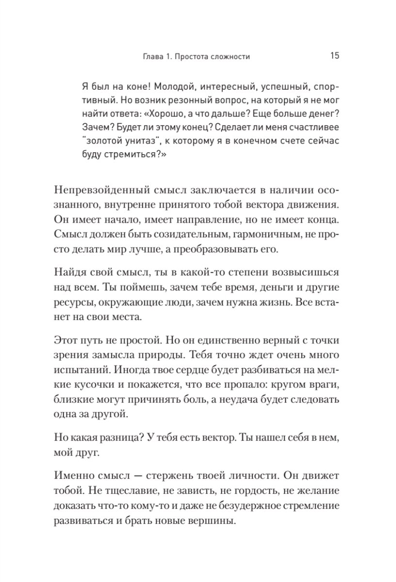 Да. Опыт это действительно богатство. Однако на то он и опыт, что особо передать его не получится, мы можем передать только свои знания, вынесенные из этого опыта. Кроме того, это опыт конкретного человека, где гарантия того, что он подойдет и совершенно другому человеку? Мне нравится мысль автора о том, что смысл жизни в раскрытии внутреннего потенциала, тут несколько моментов, это и постоянный рост, и стремление к большему, что я поддерживаю и к чему сама склоняюсь, и самореализация, которая наполняет нас духовно, если мы занимаемся любимым делом. И даже эти процессы запускают еще много второстепенных процессов, в которых и складывается движение, рост и жизнь. Мысль о том, что находить себя по сути и не надо, надо лишь вспомнить себя в детстве, и свои, скажем так, желания и чувства до того, как мы столкнулись лбами с окружающим миром и были вынуждены жить по чьим-то правилам: родителей, школы, общества и тд, тоже очень мне отзывается. Эту мысль я увидела в блоге у одной девушки совсем недавно и она определенно мне полюбилась. Однако, есть и вещи, о которых пишет автор и которые мне совсем чужды. Так, например, слово "предназначение" просто режет мне слух, для себя я оставила это слово где-то далеко, вместе с "судьбой". Кроме того, сколько бы мы не разглагольствовали о том, что не в деньгах счастье, ты сможешь понять это, только когда они у тебя уже будут в нужном количестве, не берем в счет тех, кто изначально не стремится к деньгам. И все же я до сих пор думаю, что нашла бы применение деньгам, чтобы они превратились в мое счастье. Такие темы часто граничат с волонтерством и помощью других, и тут так же, и все же, разве с деньгами ты не сможешь помочь другим больше? Вопрос "чем я могу быть полезен окружающим?", который автор ставит во главу угла, как по мне, давно сменился на здоровое "что приносит счастье МНЕ?". Потому что нет ничего полезнее для окружающих, чем счастливый человек, и если он хочет помогать другим, это отлично, а если он хочет заниматься гедонизмом, то и мы не в праве его судить. Да. Собственно, так и заканчивается моя попытка послушать какого-нибудь "наставника". Автор книги является так же наставником для детей и подростков, возможно, в школьном возрасте мне был бы полезен такой мотивационный спик, но сейчас я предпочту психологию. Терапия откроет в Вас как раз таки Ваш смысл жизни, который будет соответствовать Вашей морали и ценностям, тогда и не придется слушать наставников, чтобы подсмотреть их "вариант ответа".