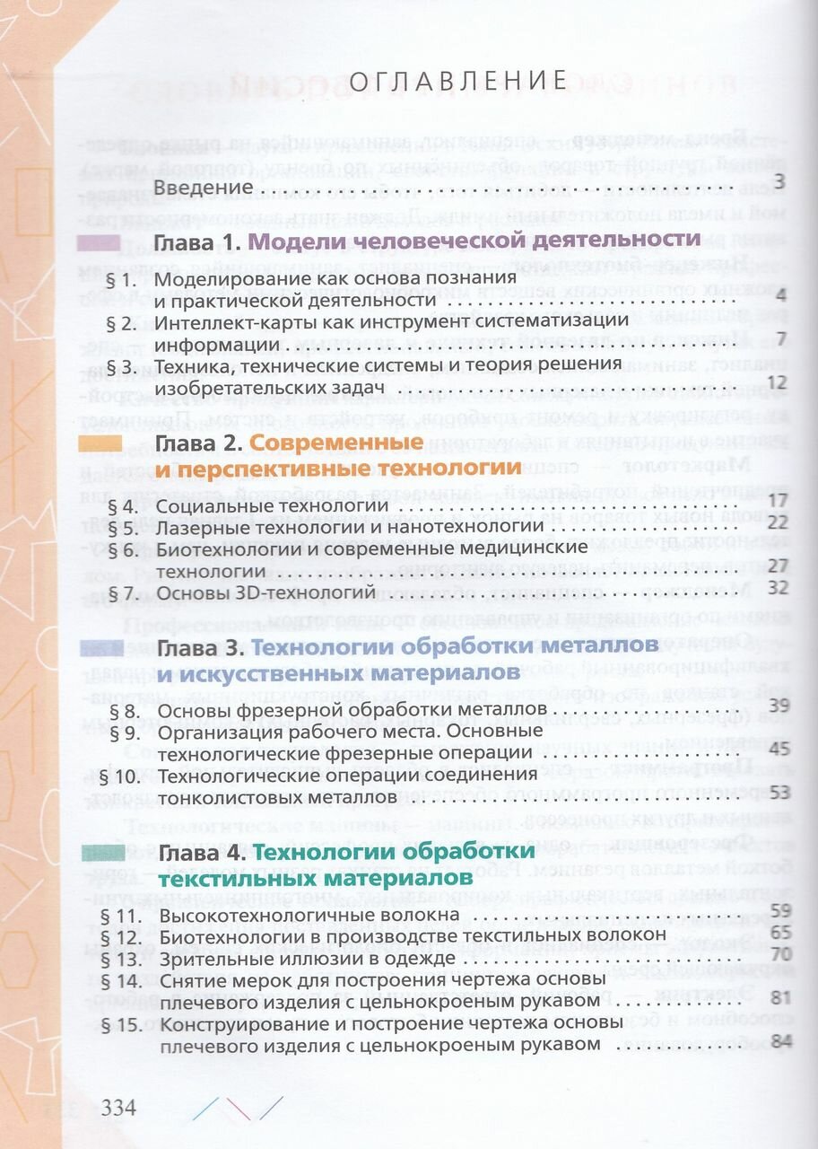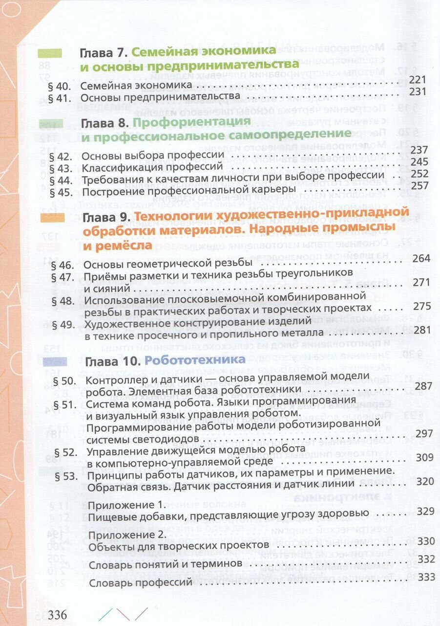 Учебник способствует пониманию обучающимися сущности технологии обработки конструкционных, текстильных материалов, пищевых продуктов, художественно-прикладной обработки материалов, формированию технологической культуры и проектно-технологического мышления, а также построению образовательного маршрута и планов в области профессионального самоопределения. Учащиеся знакомятся с биотехнологиями, современными медицинскими, социальными, лазерными и нанотехнологиями. Рассматривают принципы семейной экономики и основы предпринимательства. Продолжают начатое ранее изучение основ электротехники и робототехники. Разрабатывают и выполняют творческие проекты.