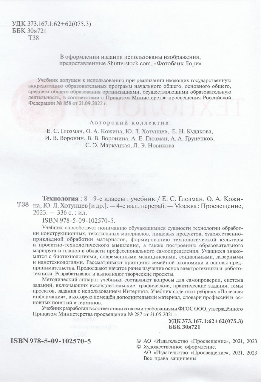 Технология. 8-9 классы. Учебник (Евгений Самуилович Глозман, Ольга Алексеевна Кожина, Юрий Леонтьевич Хотунцев); Просвещение, 2025