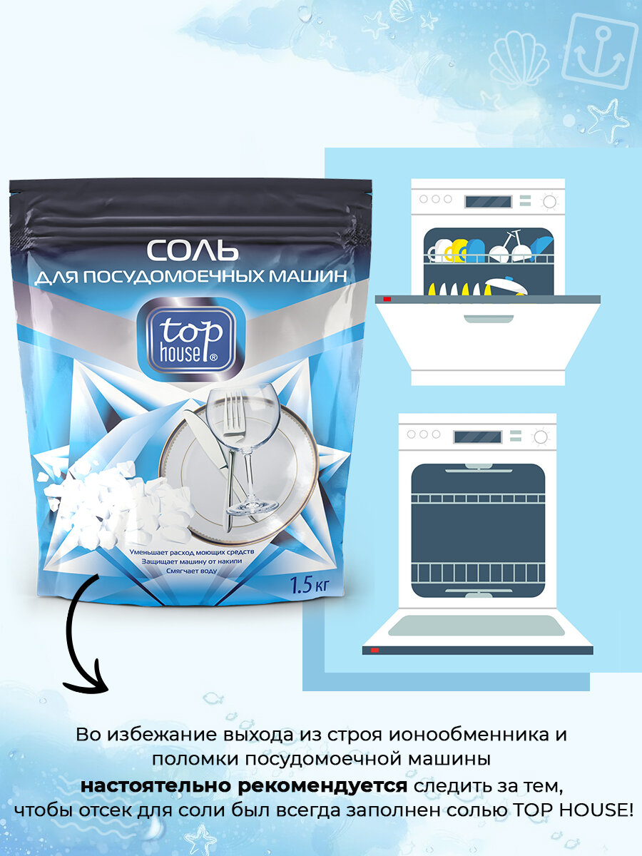 Во избежание выхода из строя ионообменника и поломки посудомоечной машины настоятельно рекомендуется следить за тем, чтобы отсек для соли был всегда заполнен солью TOP HOUSE!