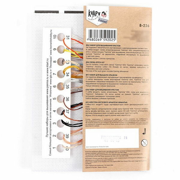 | В набор входит | канва аппретированная К04 Aida №14 "Gamma" белого цвета, хлопчатобумажные нитки мулине "Gamma" на держателе (15 цветов), специализированная игла с тупым концом "Gamma" для вышивания, подробная инструкция по вышиванию и схема. |