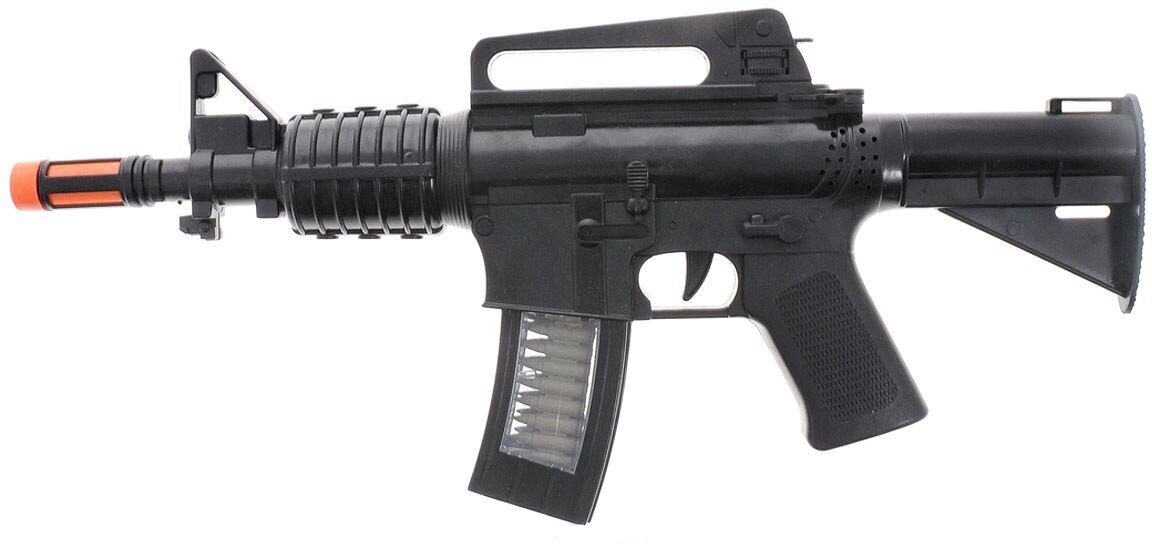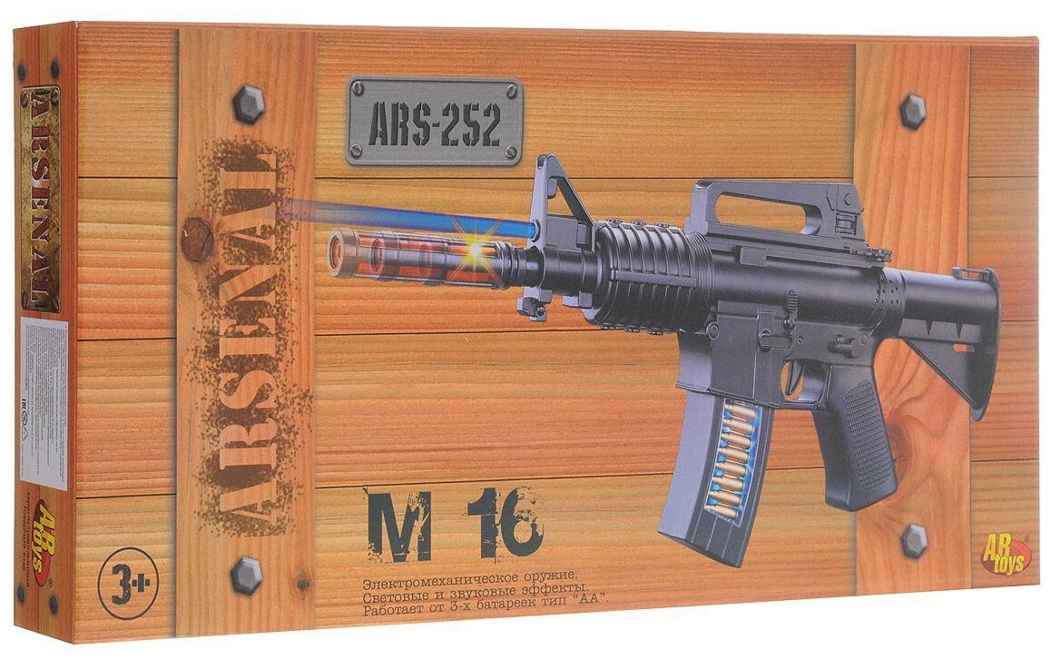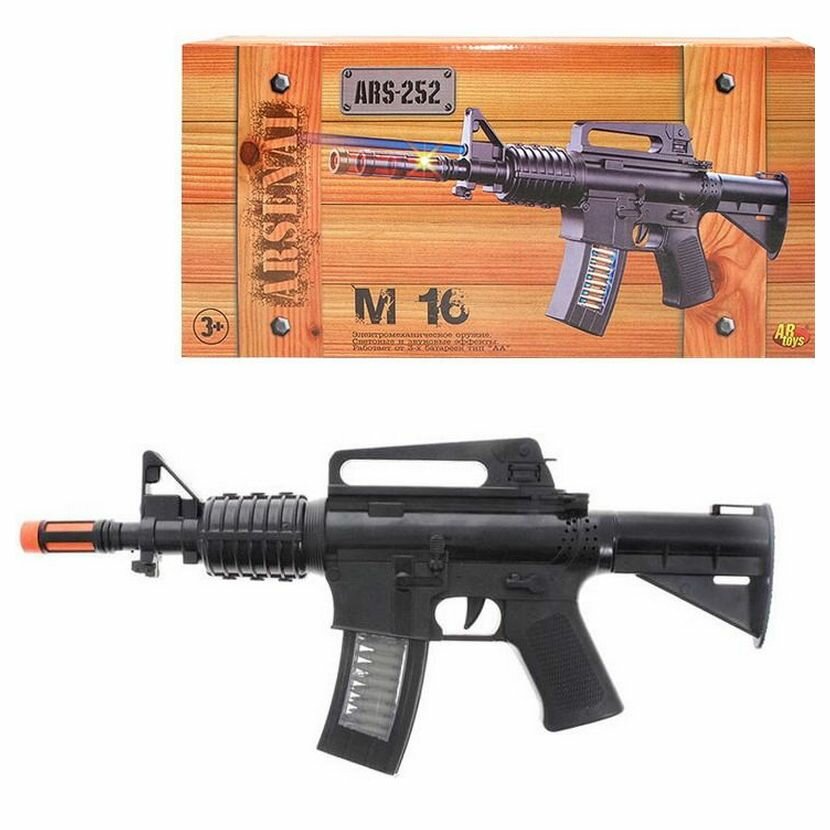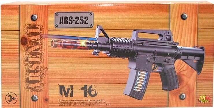 С таким оружием можно придумать разнообразные сценарии военных игр. Все зависит от фантазии вашего юного солдата! В игре мальчик может оборонять границы, склады с важным грузом или идти в атаку на противника. Винтовка М16 сделана из прочного долговечного пластика, благодаря которому эксплуатационные качества игрушечного оружия будут всегда на высоте. Игрушка представляет серию моделей пневматического оружия «ARSENAL», выпускаемую английским брендом Rinzo.