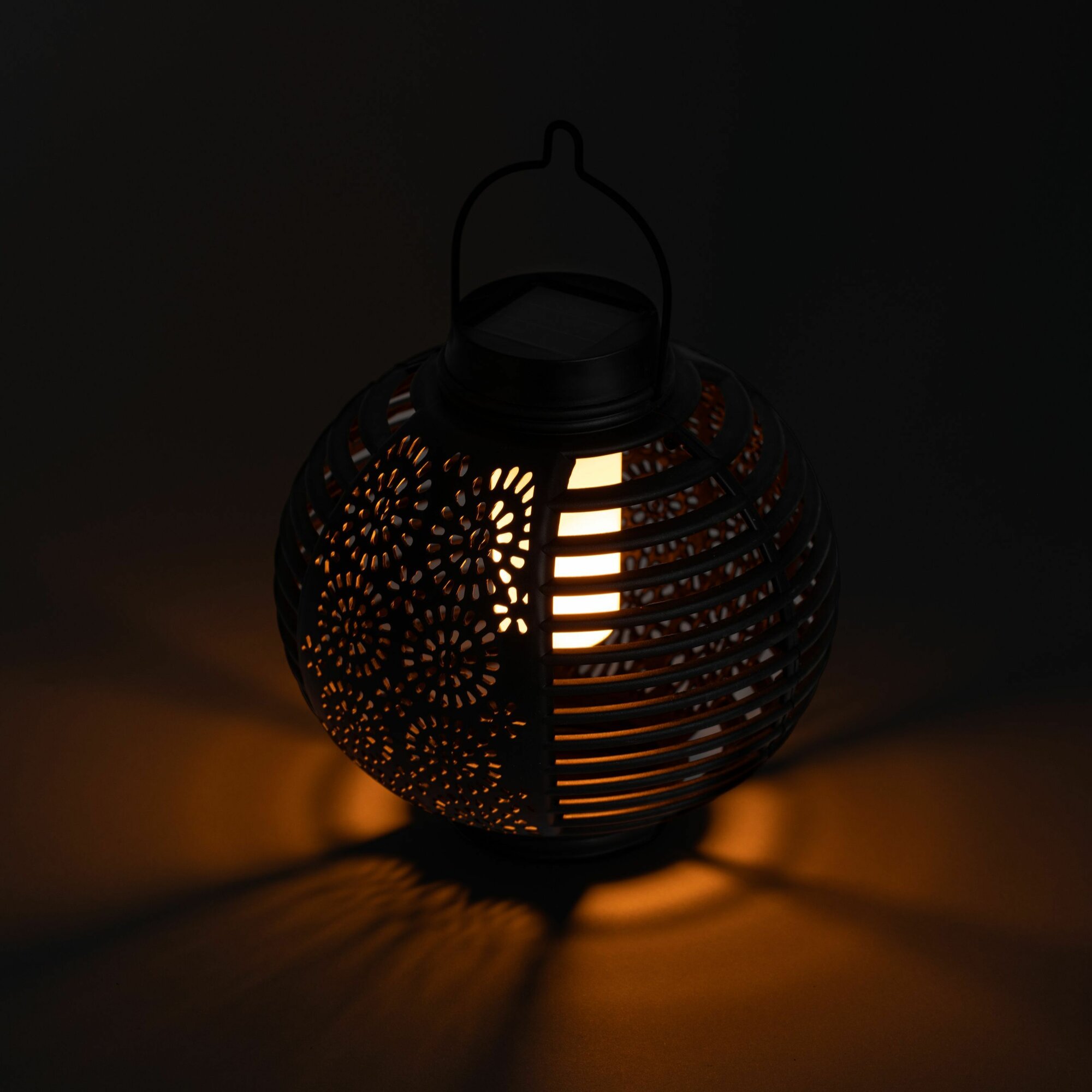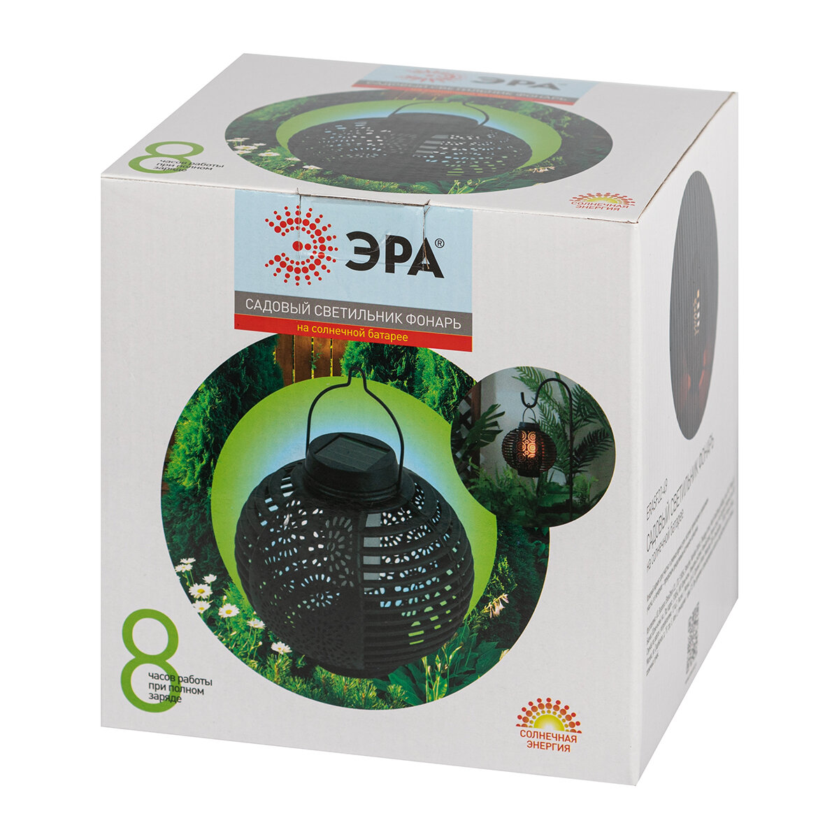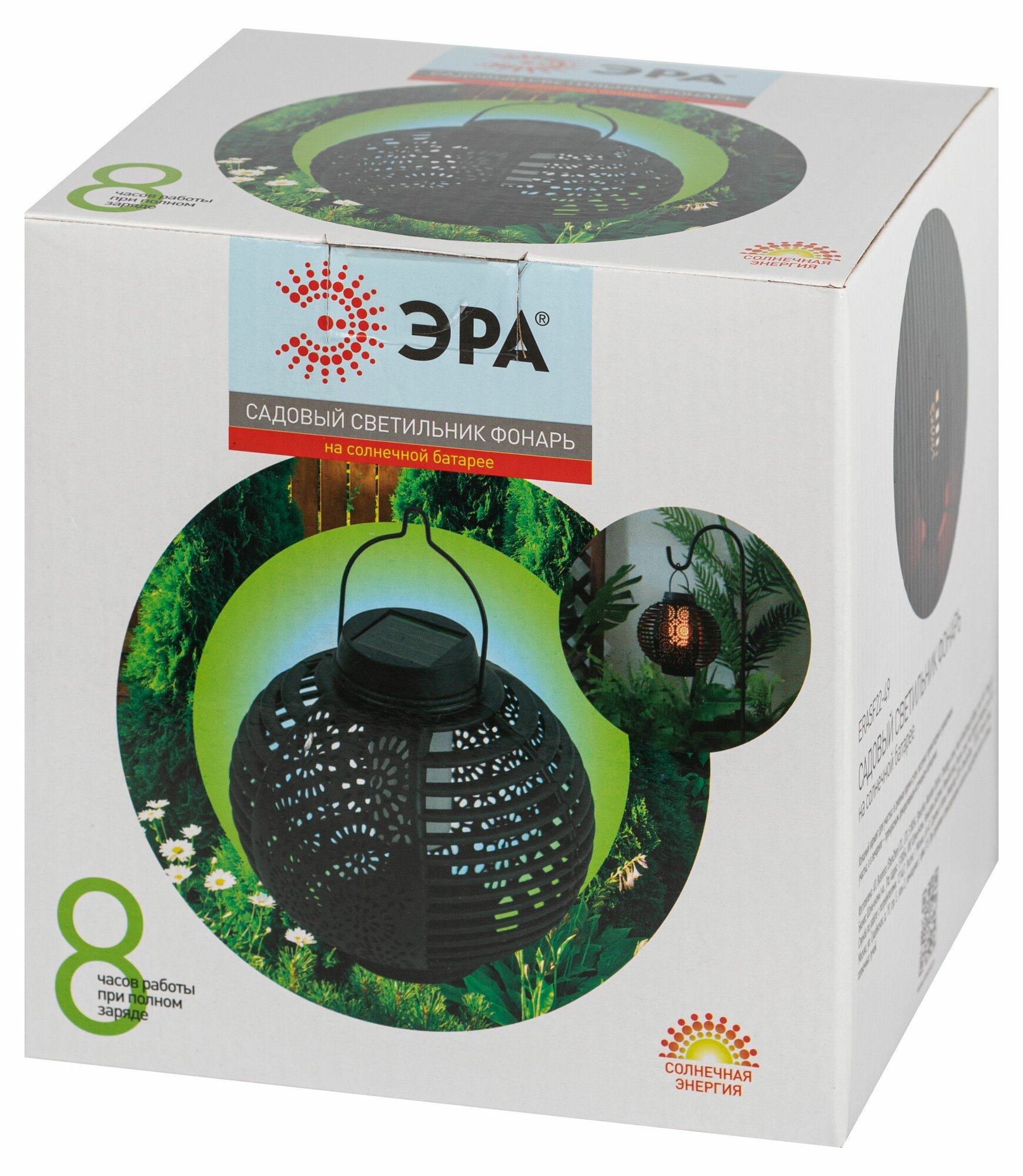 Подвесной круглый фонарь садовыйЭРА ERASF22-49 (арт. ) с узорчатой перфорацией для красивого светового рисунка и динамичным тёплым светом, имтирующим свет живого огня. Лёгкий и прочный уличный фонарь с ручкой для подвеса и удобного переноса поставляется в комплекте с эффектным изогнутым держателем. Стойка легко устанавливается в грунт за счёт заострённого колышка. Внутри круглого перфорированного плафона -яркий светодиод тёплой цветовой температуры. Встроенная солнечная батарея позволяет размещать светильник-фонарь в любом месте загородной территории. Солнечная энергия - экономичный и экологичный источник энергии. После подзарядки от дневного света, данный подвесной уличный светильник самостоятельно включится, как только наступят сумерки.