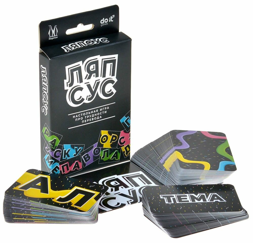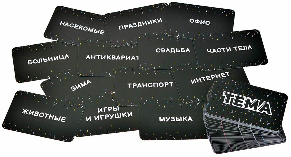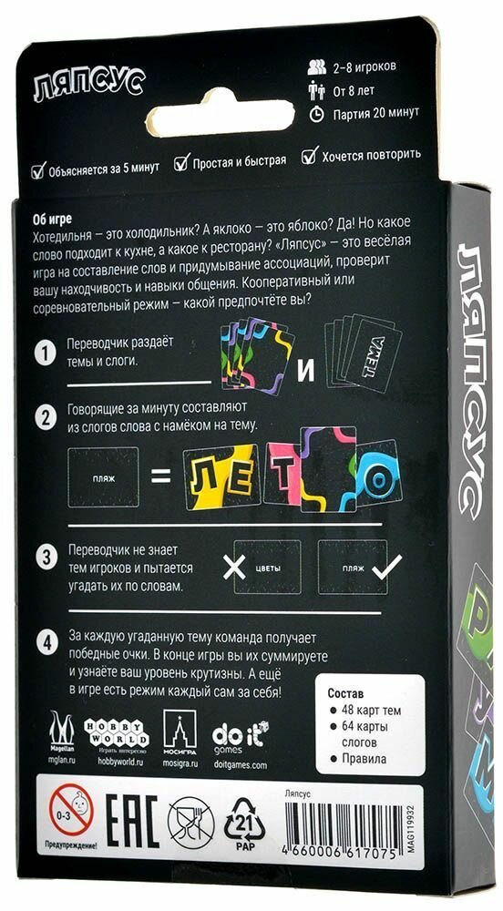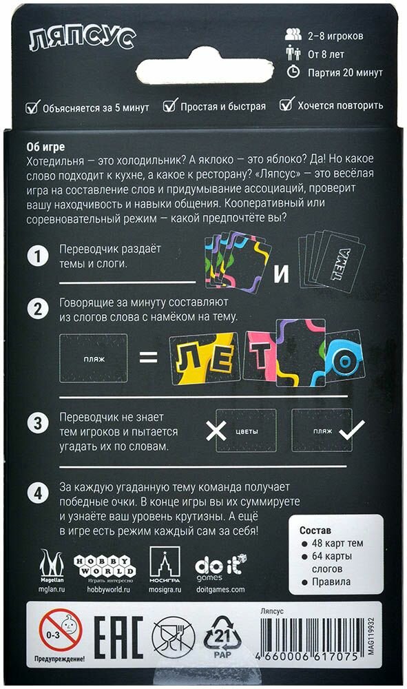 | Комплектация | 48 карт тем, 64 карты слогов, Правила игры |