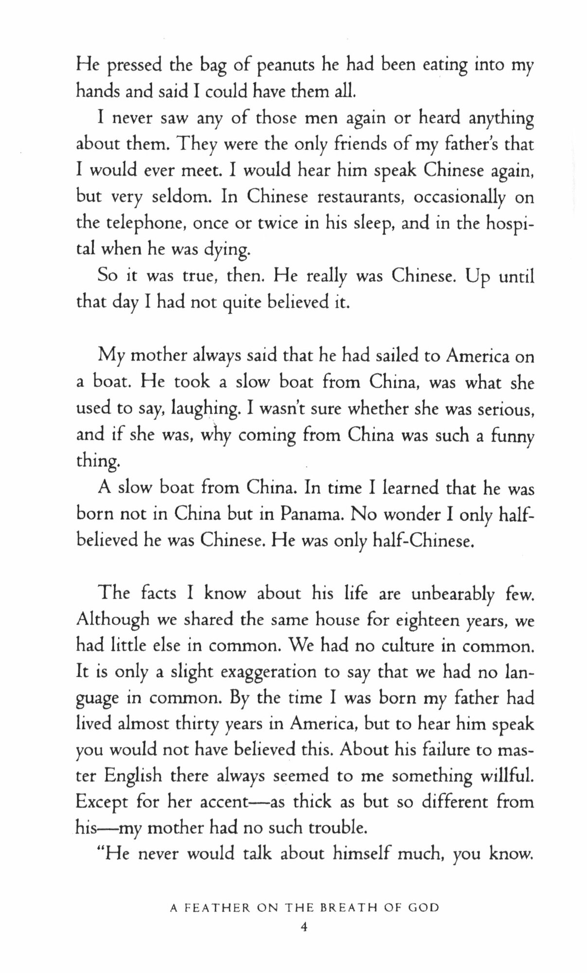 A young woman looks back to the world of her immigrant parents: a Chinese-Panamanian father and a German mother, who meet in postwar Germany and settle in New York City. Growing up in a housing project in the 1950s and 1960s, the narrator escapes into dreams inspired both by her parents' stories and by her own reading and, for a time, into the otherworldly life of ballet. A yearning homesick mother, a silent and withdrawn father, the ballet-these are the elements that shape the young woman's imagination and her sexuality.