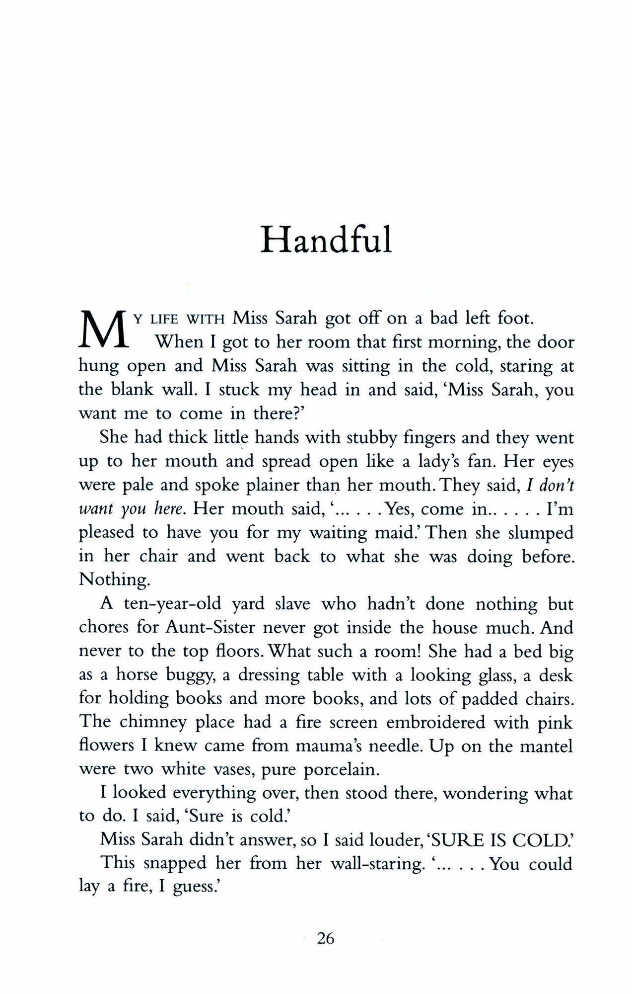 Sarah Grimke is the middle daughter. Her mother says she's difficult and her father says she's remarkable. On Sarah's eleventh birthday, Hetty 'Handful' Grimke is taken from the slave quarters she shares with her mother, wrapped in lavender ribbons, and presented to Sarah as a gift. Sarah knows that what she does next will unleash a world of trouble. She also knows that she cannot accept another person as a present. And so, indeed, the trouble begins ...