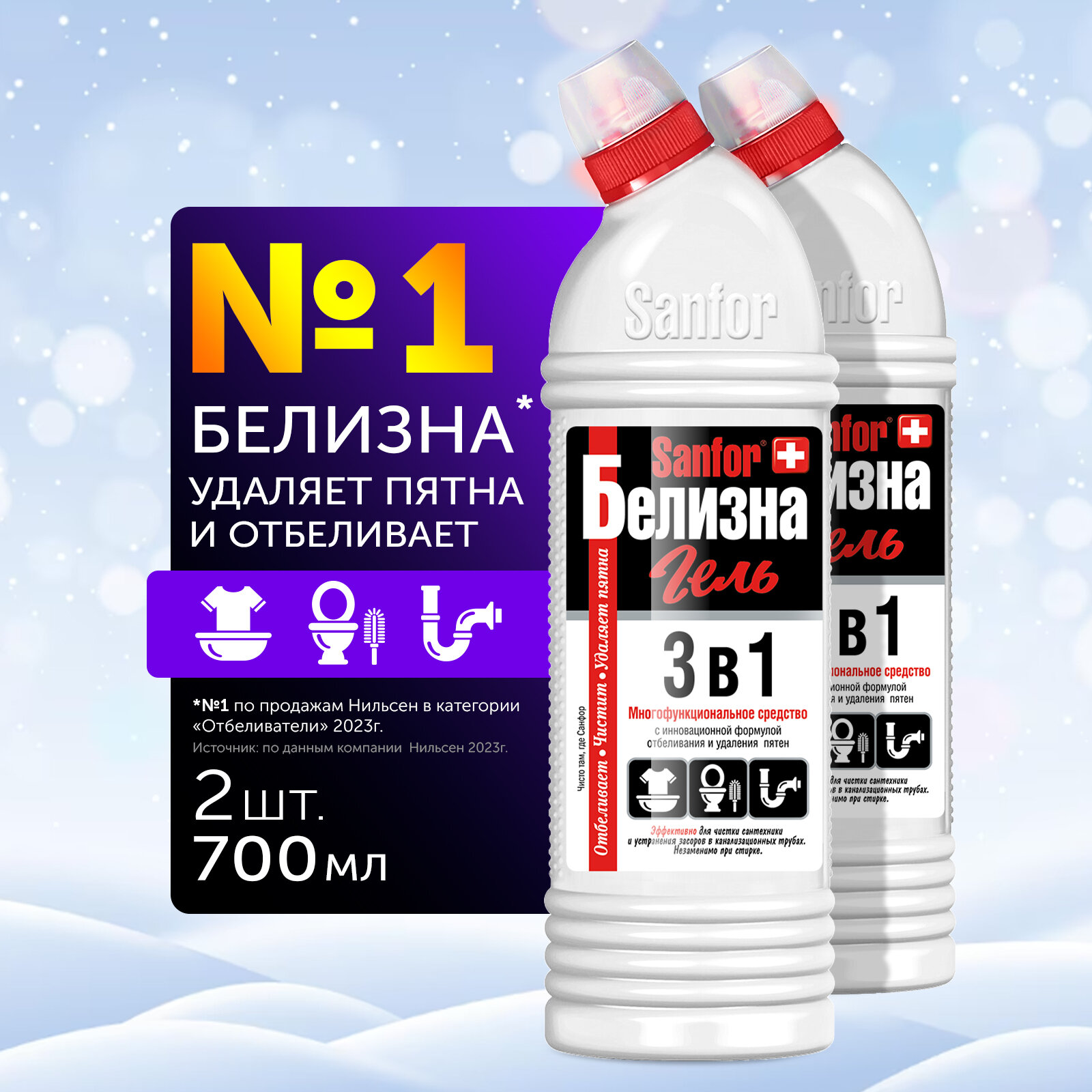 Специальное густое средство от Sanfor с инновационной формулой отбеливания и удаления пятен. Благодаря комплексному действию 3 в 1 незаменимо при стирке, а также для дезинфекции и чистки сантехники и труб.