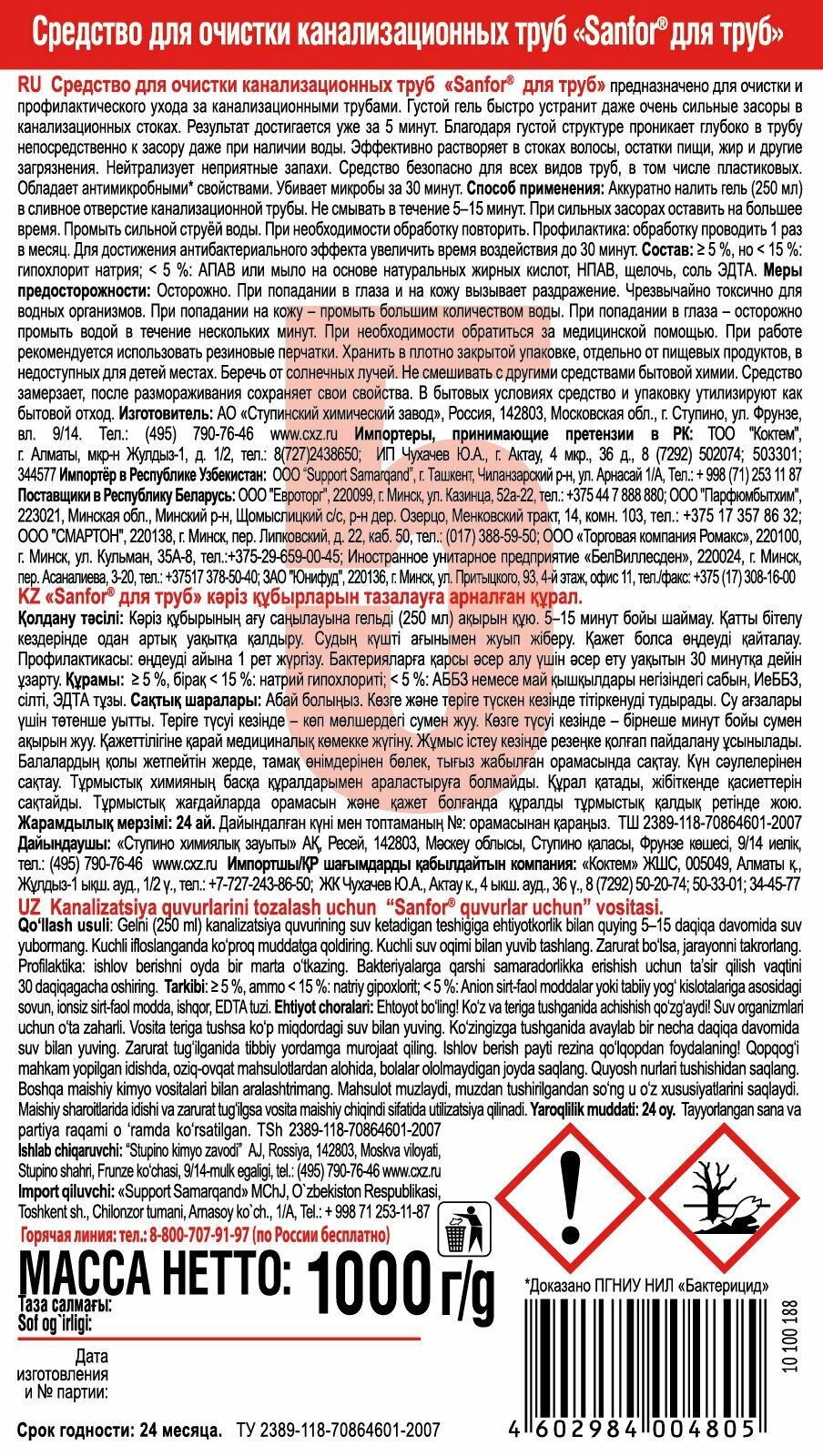 Чистящее средство Sanfor Для канализационных труб 5л Ступинский химический завод