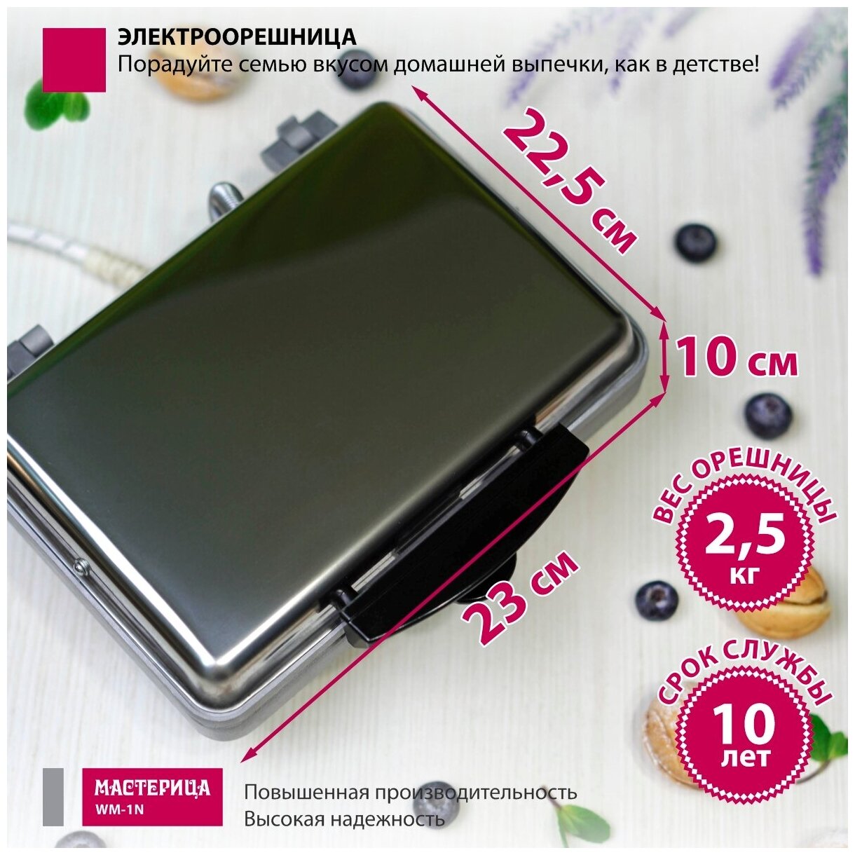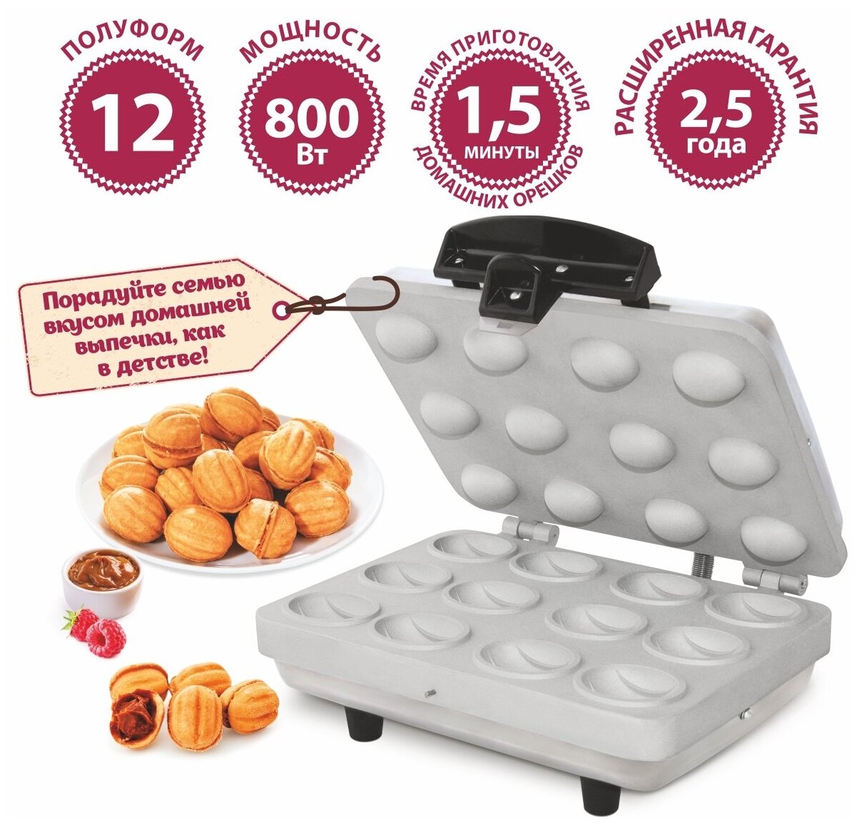 Вафельница-орешница Мастерица , 12 полуформ! Орешки за 1.5минуты! Порадуйте семью вкусом домашней выпечки, как в детстве! Материал корпуса: металл, нагревательные элементы из пищевого алюминия, встроенный терморегулятор, наличие двойной системы защиты от перегрева. Большая толщина плит нагрева обеспечивает более стабильную температуру процесса выпечки, за счет этого происходит равномерный и быстрый процесс выпечки. Срок службы - 10 лет. Сделано в России. Мощность 800Вт. Рабочее напряжение 220В. Вес прибора 2.5кг. Габаритные размеры: 230х225х100мм. Длина гибкого соединительного шнура 1.5м. ТМ Мастерица: Повышенная производительность! Высокая надежность!