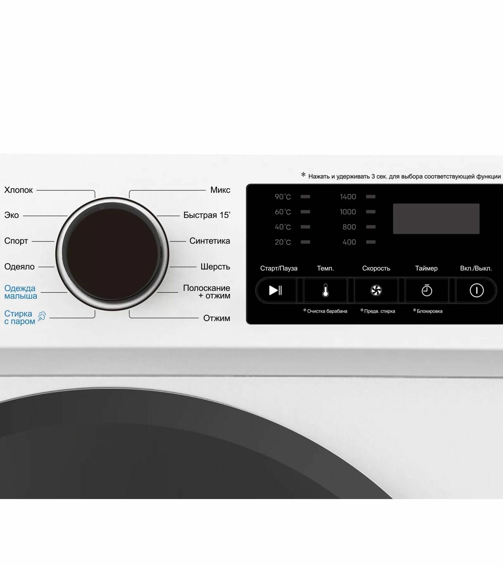 | Программы | хлопок, эко, спортивная одежда, шерсть/ручная стирка, одеяло, смешанная одежда, синтетика, детская одежда, быстрая 15, полоскание+отжим, отжим, пар |