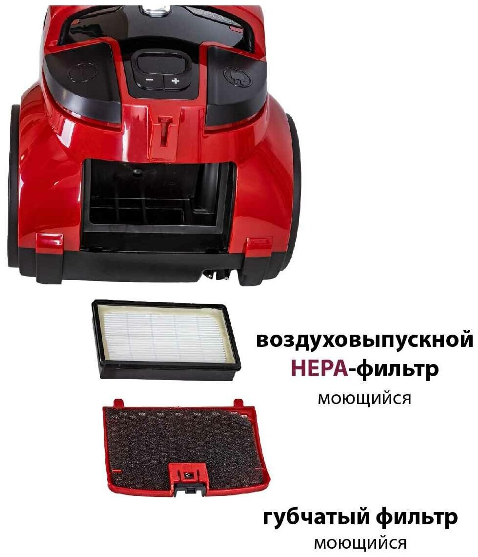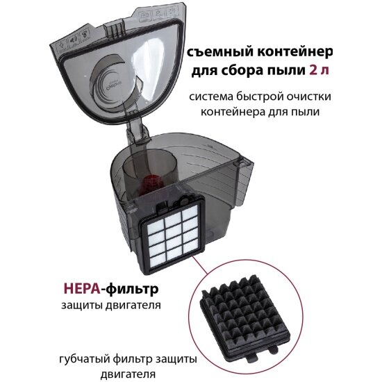 Большой объем пылесборника: емкость в 2 литра позволяет собирать большое количество пыли и грязи без частого опорожнения;