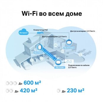Deco X50-PoE - система Mesh Wi?Fi 6 класса AX3000 с поддержкой PoE со скоростью передачи до 574 Мбит/с на 2,4 ГГц и до 2402 Мбит/с на 5 ГГц. Использование Wi-Fi 6 в Mesh-системе позволяет получить прирост к площади покрытия, скорости и количеству одновременно подключённых устройств. Технология модуляции 1024-QAM обеспечит скорость подключения до 3 Гбит/с, которой будет достаточно для выполнения ресурсоёмких задач, таких как облачный гейминг и просмотр потоковых видео 8К — наслаждайтесь онлайн-трансляциями с безупречным качеством изображения и звука без буферизации. Благодаря поддержке PoE устройство Deco X50-PoE способно получать питание и обмениваться данными по одному кабелю Ethernet. Также возможно стандартное подключение к электросети (адаптер питания идёт в комплекте). Модули Deco взаимодействуют друг с другом и образуют единую Mesh-сеть, которая обеспечит стабильный Wi-Fi в каждой комнате. Нужно увеличить площадь покрытия? Просто добавьте ещё один модуль Deco.