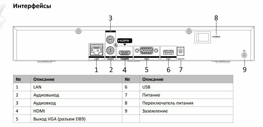 | Интерфейсы | VGA (1), HDMI (1), аудиовыход (1), USB (2), RJ-45 (LAN) (100 Мбит/с), тревожные входы (4), релейные выходы (1) |