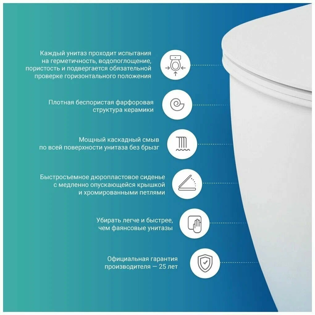 На фото по сути отобразил все достоинства унитаза: ровность покрытия, ярко белый цвет, сиденье медленное в цвет все того же унитаза (снимается быстро с унитаза за счет фиксаторов, нажимаешь на них, сиденье отщеликавается). Кстати, из незаметного - отверстия через которые вода поступает в чашу расположены по всему периметру чаши унитаза (отобразил детально этот момент на фото). При покупке не обратил на этот момент внимание, по факту дома заснял и демонстрирую кому любопытно.Достоинства: