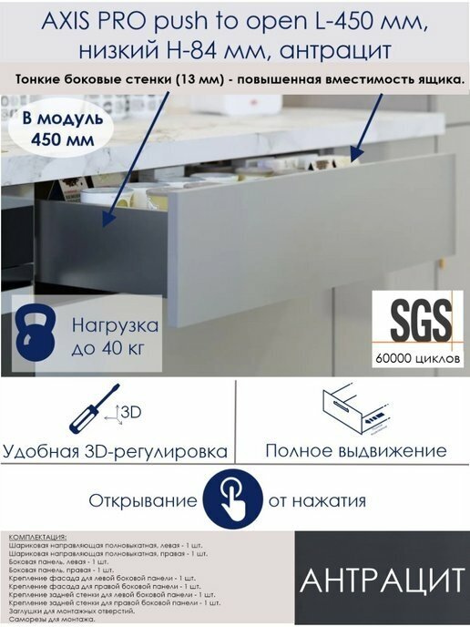 AXIS PRO push to open L-550 мм, высокий H-199 мм, белый - мебельная система выдвижения, представляющая собой набор из направляющих и боковых стенок, для сборки выкатного ящика. Система предназначена для использования в кухонных гарнитурах, а также в шкафах и тумбах различного назначения, где конструктивно предусмотрены выдвижные ящики.