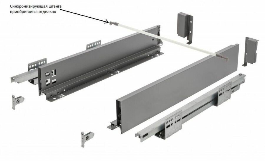 При отсутствии синхронизирующей штанги, но соблюдения соотношения "длина направляющей / ширина фасада", ящик выдвигается при нажатии на середину фасада.