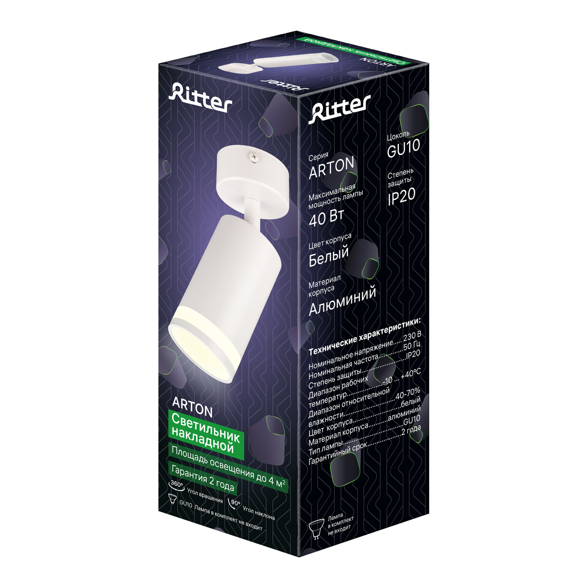 Настенно-потолочный поворотный светильник в форме цилиндра Arton Ritter предназначен для акцентного освещения интерьера. В светильнике предусмотрена одна лампочка с цоколем GU10, максимальной мощностью 40 Вт. Светильник просто монтируется и надежно фиксируется.Спот можно использовать в качестве настенного светильника вместо традиционных бра. А также вешать как потолочный светильник. Строгие геометрические формы точечного светильника позволяют использовать потолочную лампу как в классических, так и в современных дизайнерских интерьерах. Накладные светильники часто располагают в гостиных, коридорах, спальнях и детских в качестве дополнительного источника света. А в небольших помещениях накладной спот может являться основным источником освещения.Благодаря цилиндрической форме поворотного светильника, свечение лампы распределяется ярко и равномерно, что позволяет получить больше света от одной лампочки. Используйте круглый светильник вместе с люстрой или как самостоятельный источник освещения.Угол поворота плафона: 360 градусов.Размер: 55х100 мм.Материал корпуса: алюминий, стекло.Цвет: черный.Цоколь: GU10.Номинальное напряжение: 230 В.Степень защиты: IP20.Выбирайте свой идеальный светильник из сотен уникальных товаров для дома и дачи в нашем магазине REV Ritter GmbH!
