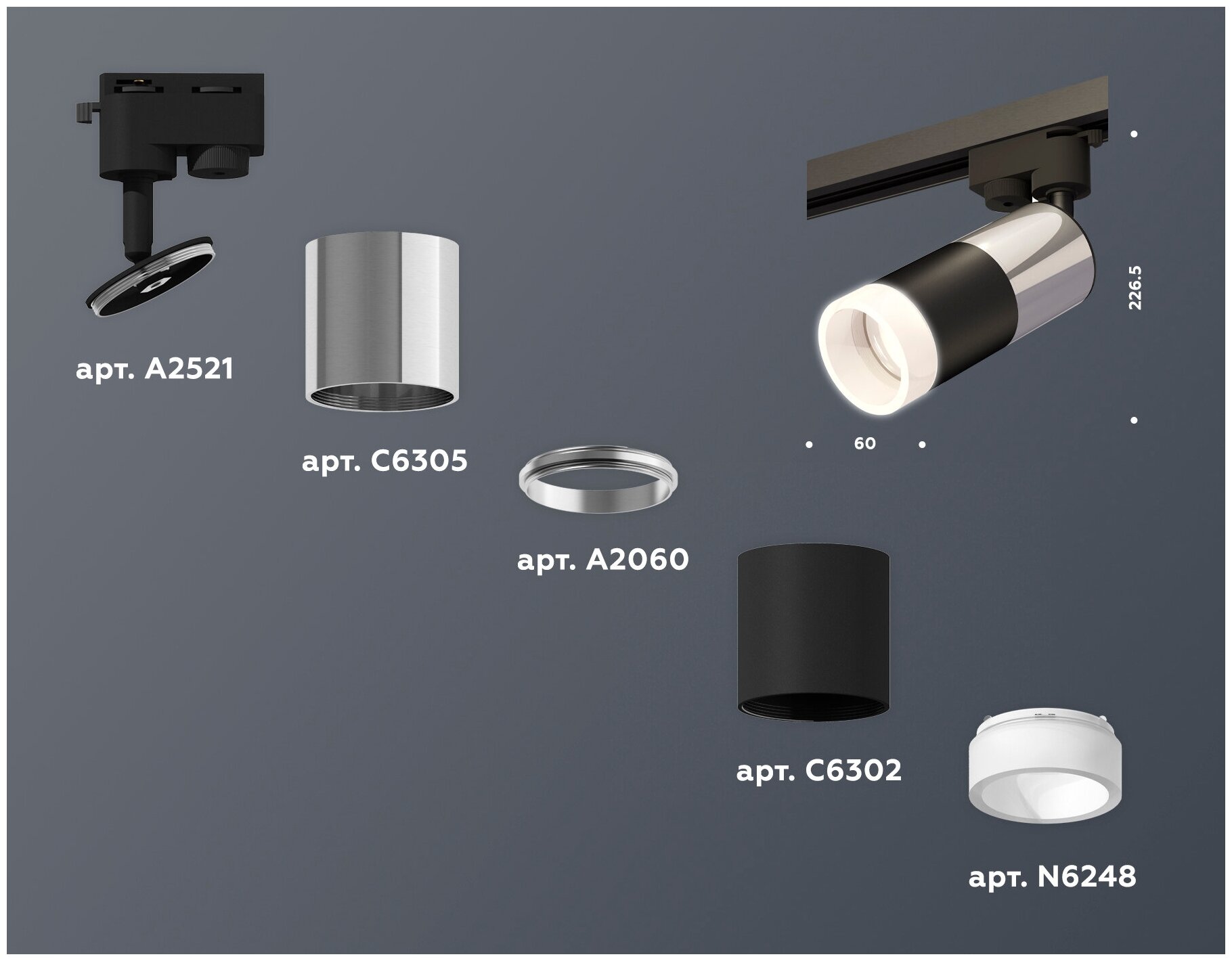 | Дополнительные характеристики | крепеж трековый D60, корпус D60*2шт (цоколь GU5.3 в комплекте), коннекторD60, насадка передняя D60 |
