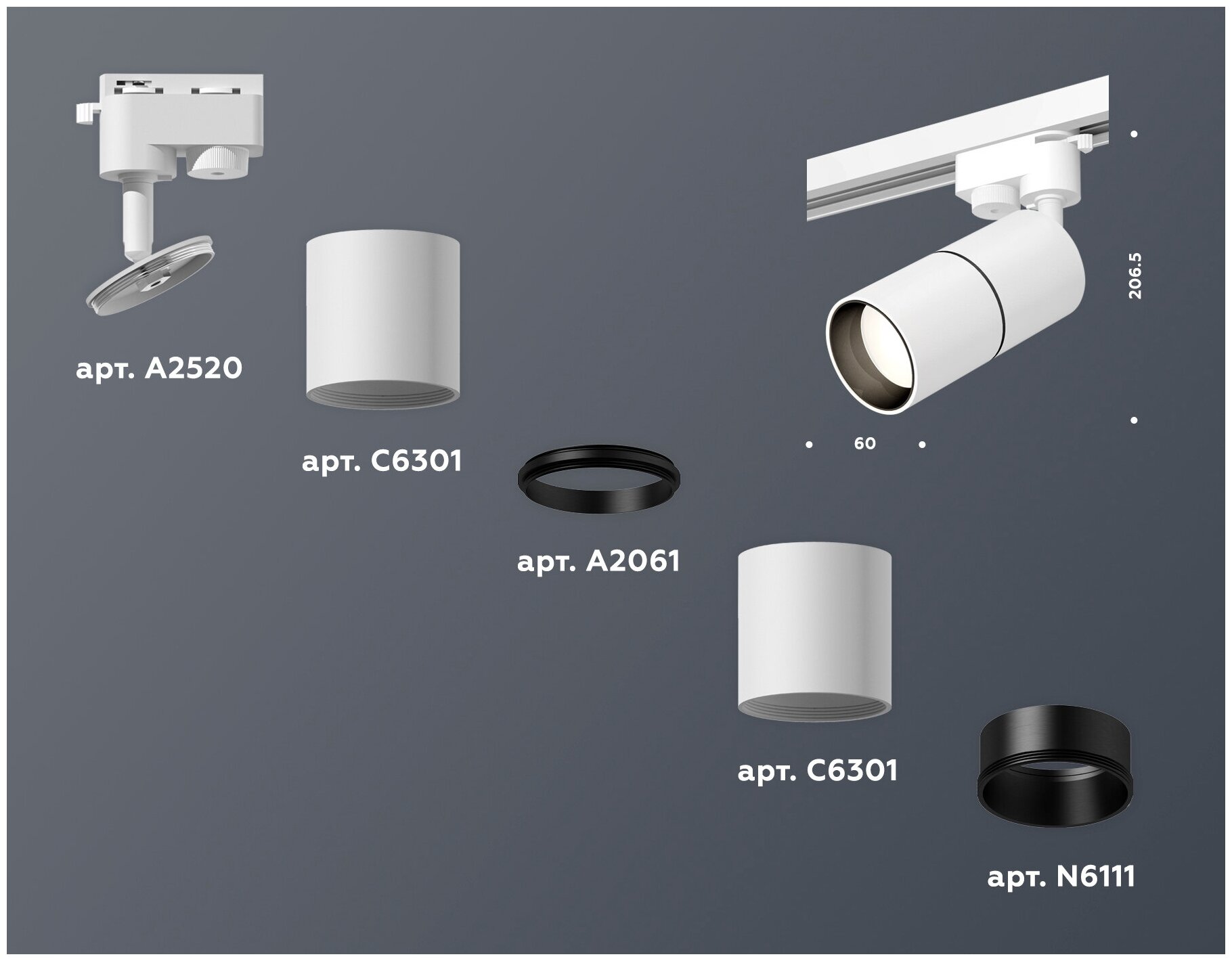 | Дополнительные характеристики | крепеж трековый D60, корпус D60*2шт (цоколь GU5.3 в комплекте), коннекторD60, насадка передняя D60 |