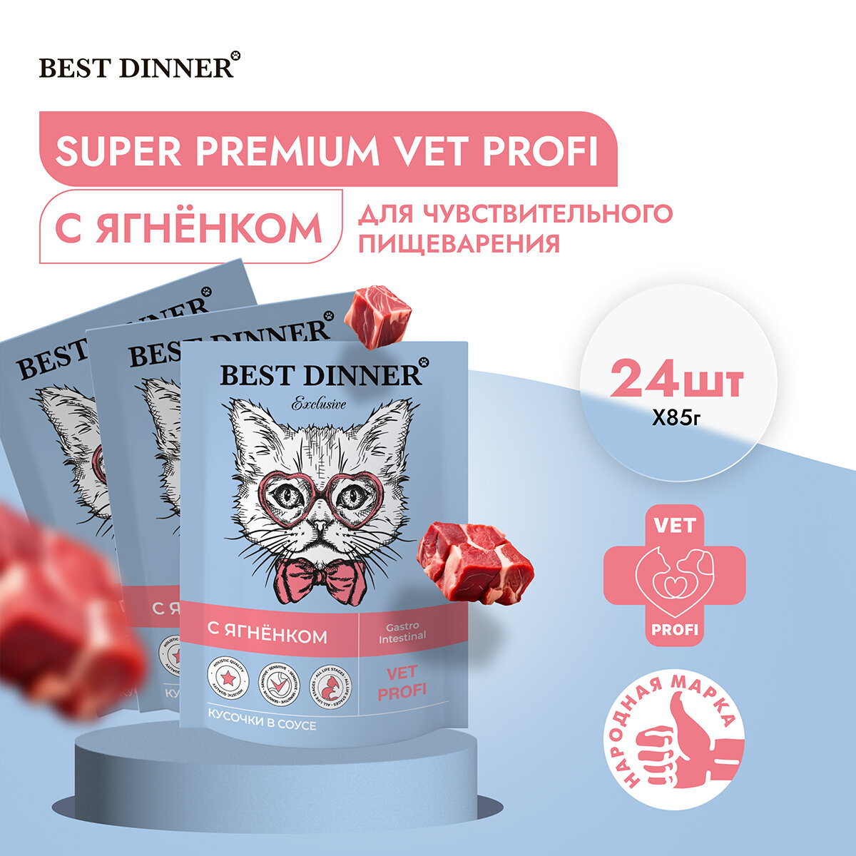 На сегодняшний день товар «BEST DINNER Exclusive Vet Profi Gastro Intestinal Корм влаж.ягненок кусочки в соусе д/кошек пауч 85г (7444)» можно купить с кешбеком в 1 магазине: Яндекс.Маркет