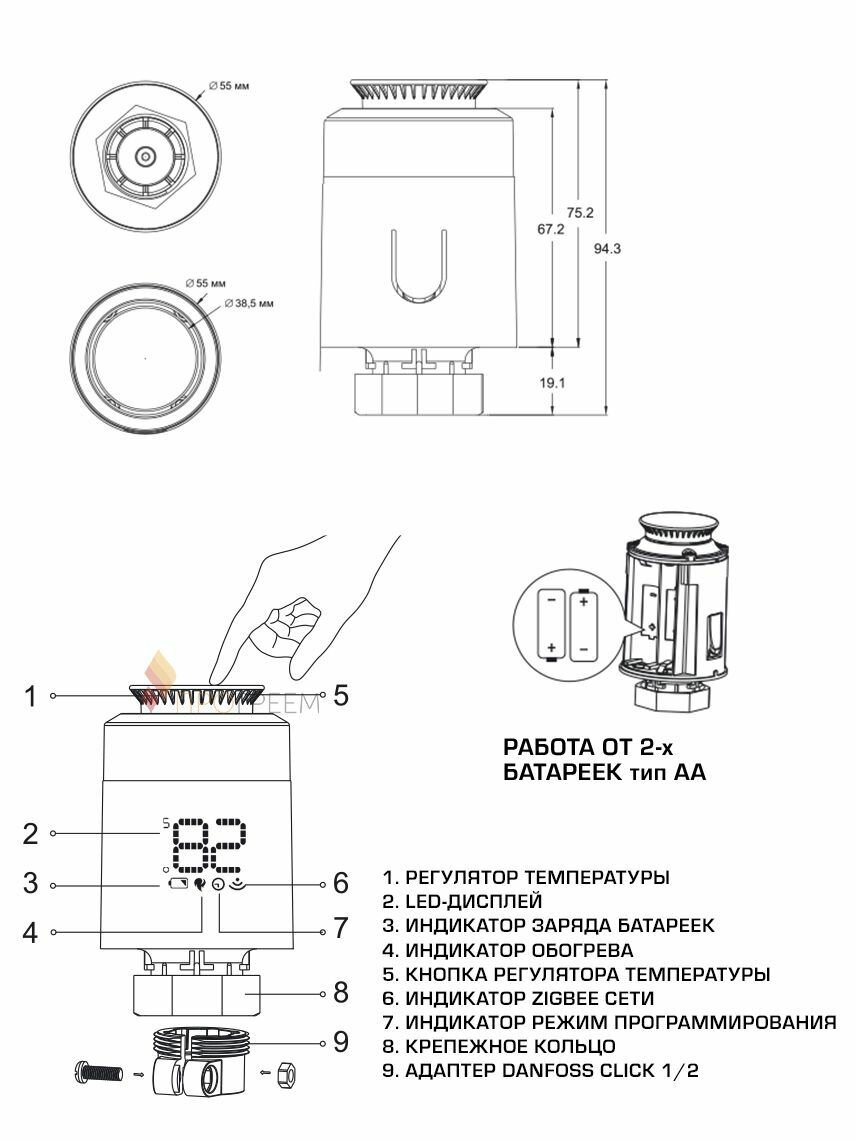 На дисплее прибора отображается необходимая информация: индикация включения и выключения обогрева, индикация температуры воздуха, индикатор Zigbee сети и режима программирования, уровня заряда элементов питания.
