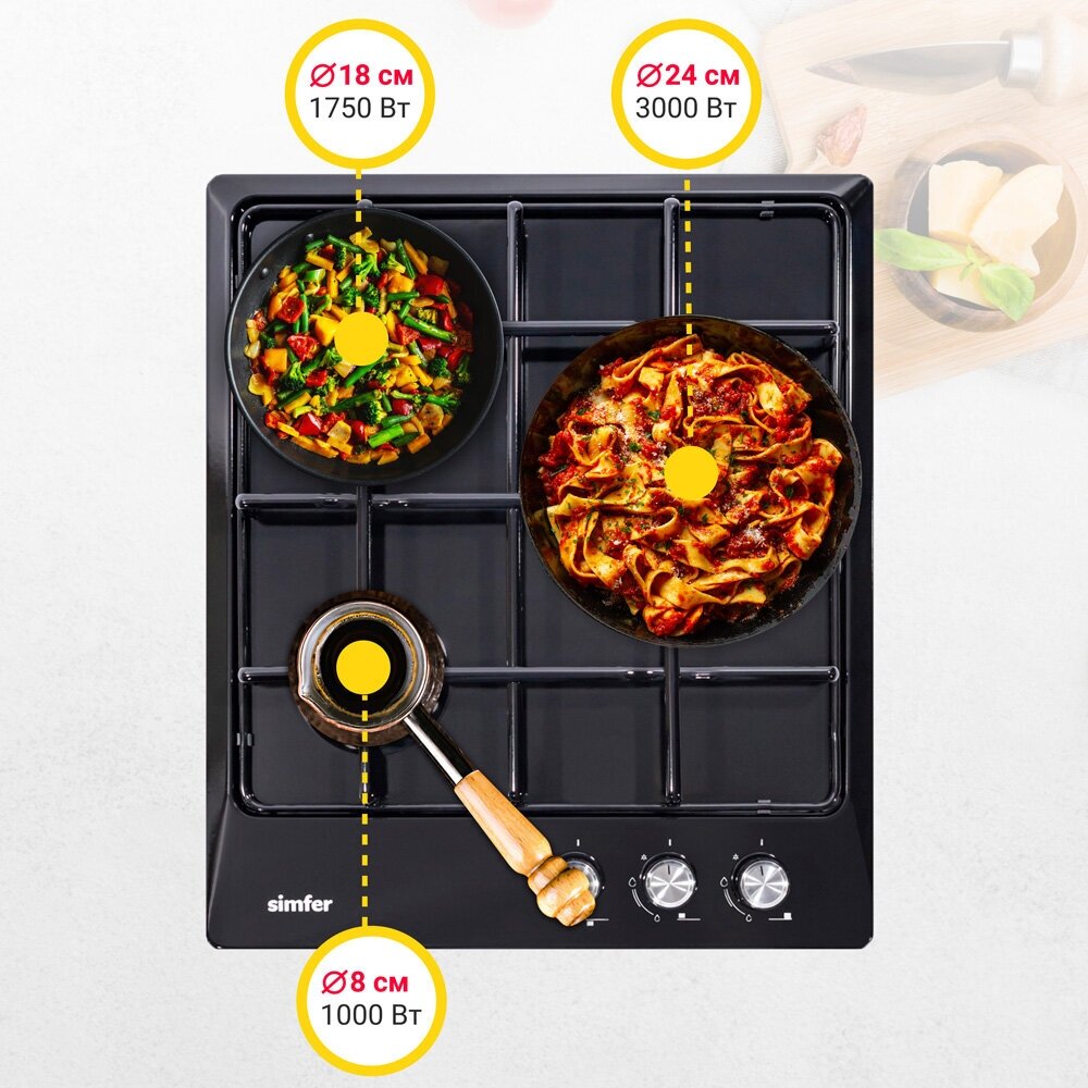 Газовая варочная панель Simfer H45V30M420 - модель, которая благодаря своим компактным размерам органично впишется в интерьер вашей кухни и сделает ежедневный процесс приготовления еды комфортным. Рабочая поверхность выполнена из прочного и долговечного материала. На ней располагаются четыре конфорки - разные по диаметру и мощности пламени в них. А значит вы сможете выбрать оптимальную конфорку для приготовления разнообразных блюд. В поворотные переключатели встроен электроподжиг, который значительно упрощает работу с панелью.