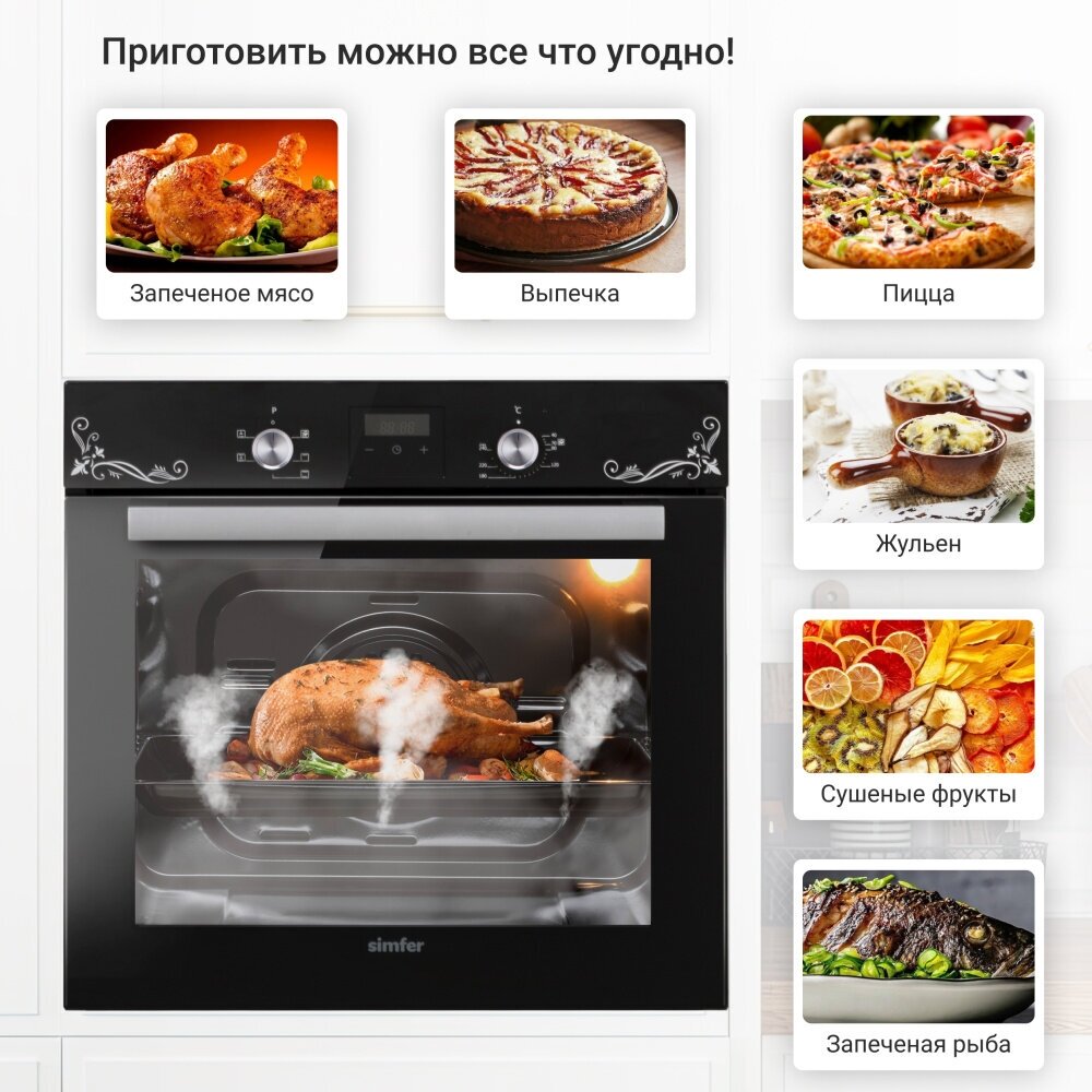 Электрический духовой шкаф Simfer B6EB56022 - современная техника для кухни, которая благодаря многообразию режимов, позволяет готовить не только повседневную пищу, но и изысканные блюда. Она снабжена функцией конвекции, которая равномерно распределяя теплый воздух, пропекает блюдо со всех сторон. С помощью удобных поворотных ручек легко выбрать необходимый режим приготовления для любого рецепта. Встроенная подсветка позволит наблюдать за процессом, не открывая при этом дверцу шкафа, а значит сохраняя тепло внутри.Таймер подскажет, когда блюдо будет готово, а двойное стекло защитит от ожога при случайном прикосновении к дверце шкафа. Эта простая в управлении, стильная и современная техника прекрасно впишется как в классический интерьер, так и в самый современный.