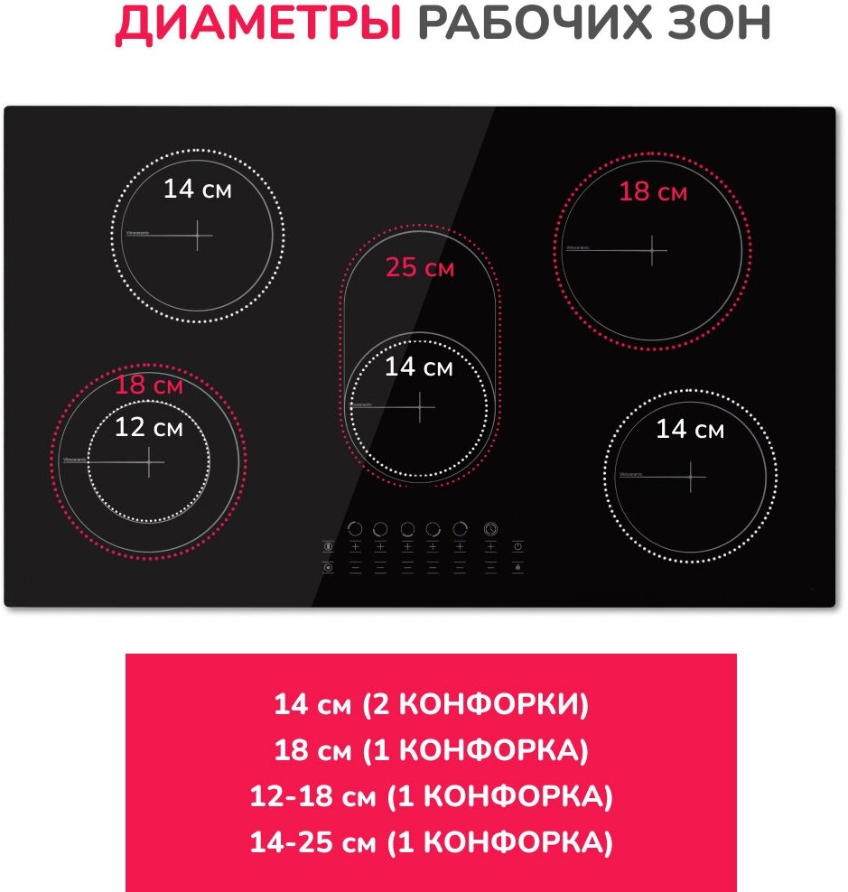| Дальняя, правая конфорка | 18 см/2.3 кВт |