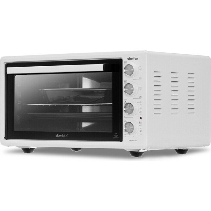Электрическая мини-печь Simfer M4586 выпускается турецкой компанией в рамках серии Albeni Plus Comfort. Она включает модели ростеров с типовыми размерами (59*38,5*33 см) и вместимостью настольной духовки (45 литров). Отличием данной модели электропечи от других становится дизайн, выполненный в преимущественно белом цвете.