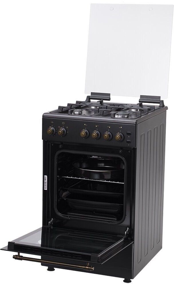 В комплекте с плитой идут один стандартный противень, один глубокий противень, хромированная решетка и набор жиклеров для баллонного газа. Также имеется откидной ящик для хранения посуды.