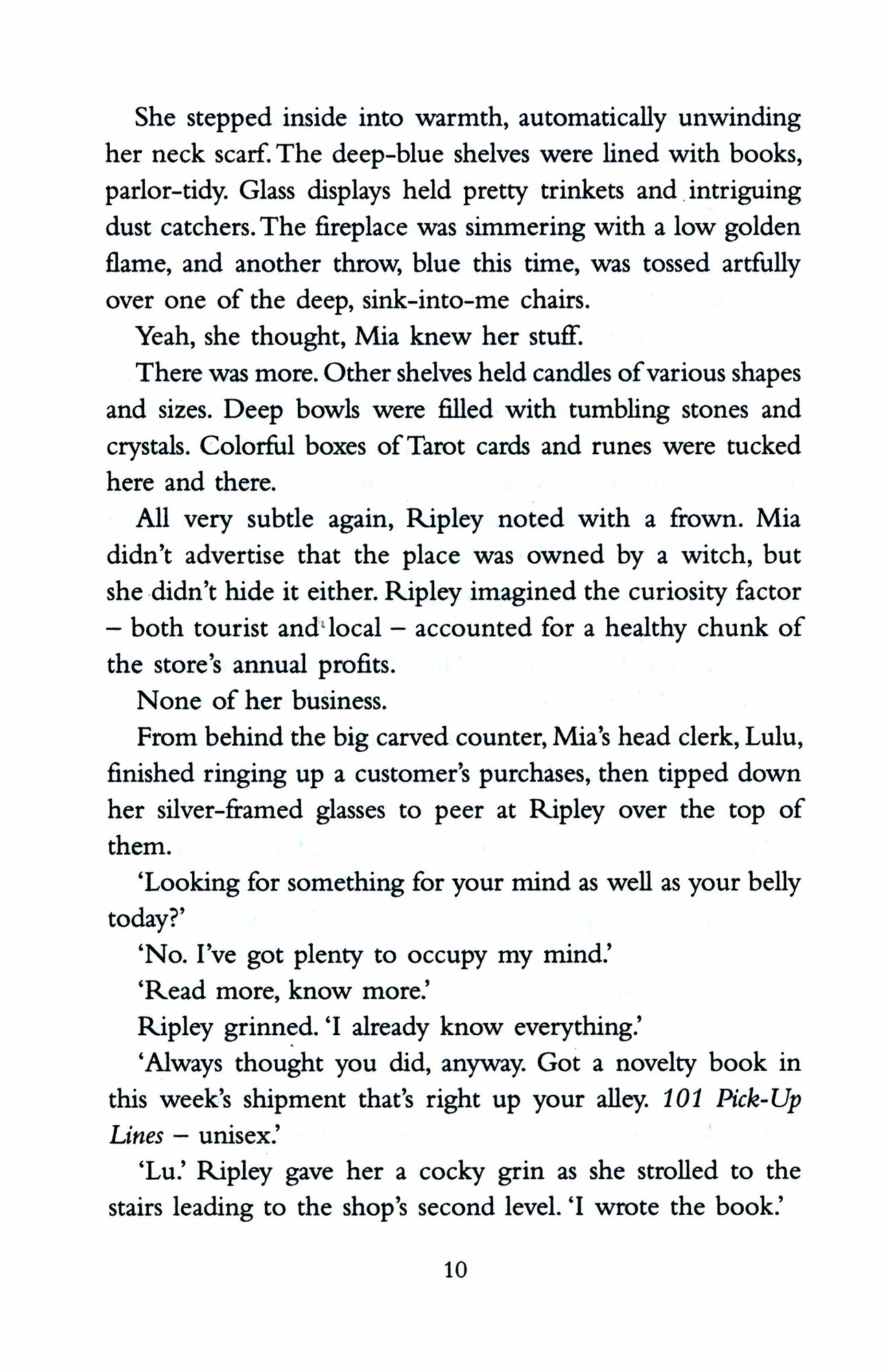 Ripley Todd just wants to live a quiet, peaceful kind of life. Her job as a sheriff's deputy keeps her busy and happy, and she has no trouble finding men when she wants them. She's perfectly content, except for one thing: she has special powers that both frighten and confuse her, and though she tries hard to hide them, she can't get them under control. Distraction soon arrives in the handsome form of MacAllister Booke - a researcher who's come to investigate the rumours of witchcraft that haunt Three Sisters Island.