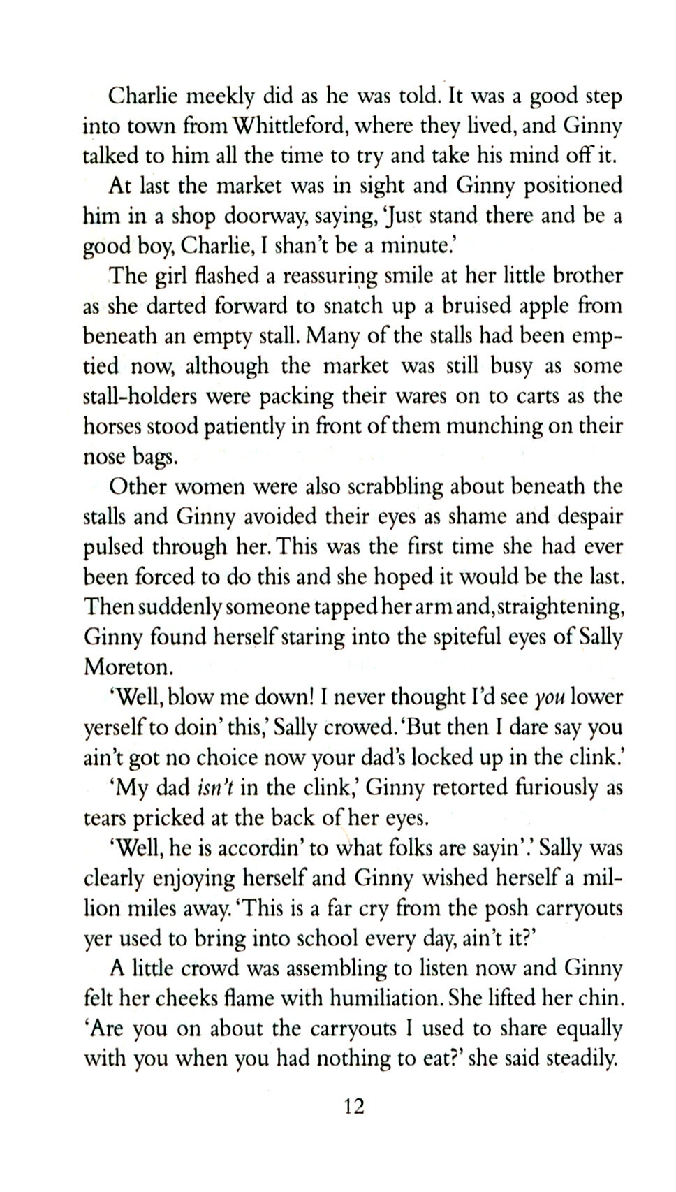 Worse is to come. Charlie is only eight years old and has a weak chest. Ginny is determined to keep him with her, but he is taken to the workhouse before she has a chance to save him. Lonely and desperate, Ginny wanders the streets of Nuneaton. She finds honest work at the pie shop - until she is forced to fight off the unwanted advances of the baker and she's out on the streets.