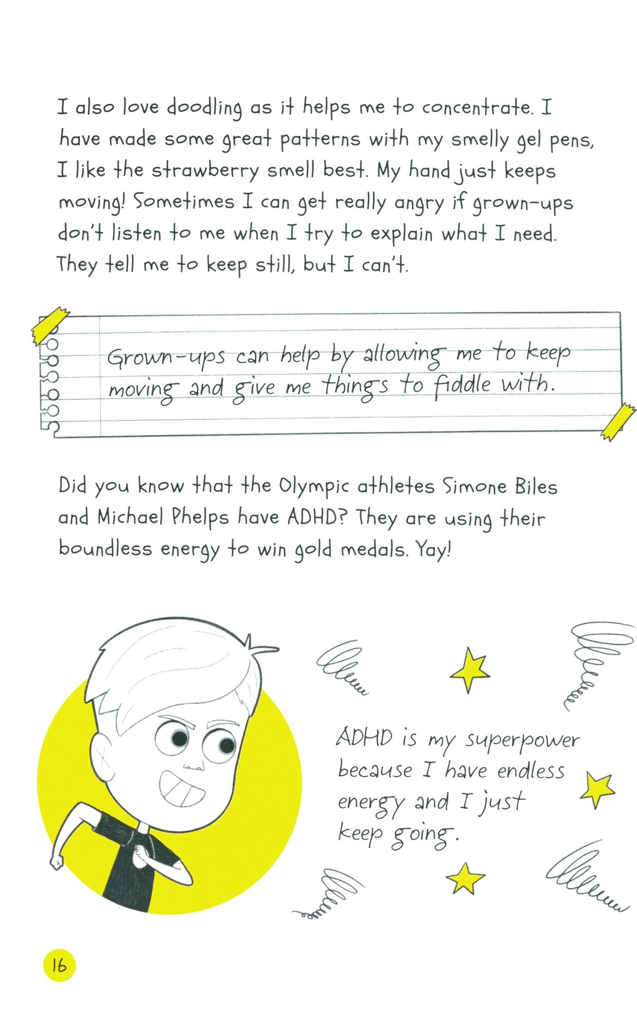 In this book you will meet different girls and boys with ADHD who can do amazing things. You might recognise some of these strengths as things that you can do too! Some of these strengths help with everyday life, like being able to hyper-focus on a task or having boundless energy to try new things. Some strengths are superpowers for interacting with others, like having a strong sense of what is fair or entertaining friends and family to make them feel happy.