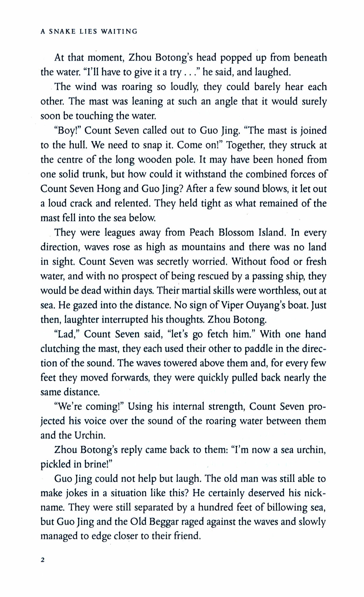 But now, along with his sworn brother, Zhou Botong of the Quanzhen Sect, and his shifu, Count Seven Hong, Chief of the Beggar Clan, he has walked into a trap. Tricked by Huang into boarding a unseaworthy barge, they will surely drown unless Lotus - who has overheard her father's plans - can find a way to save them.
