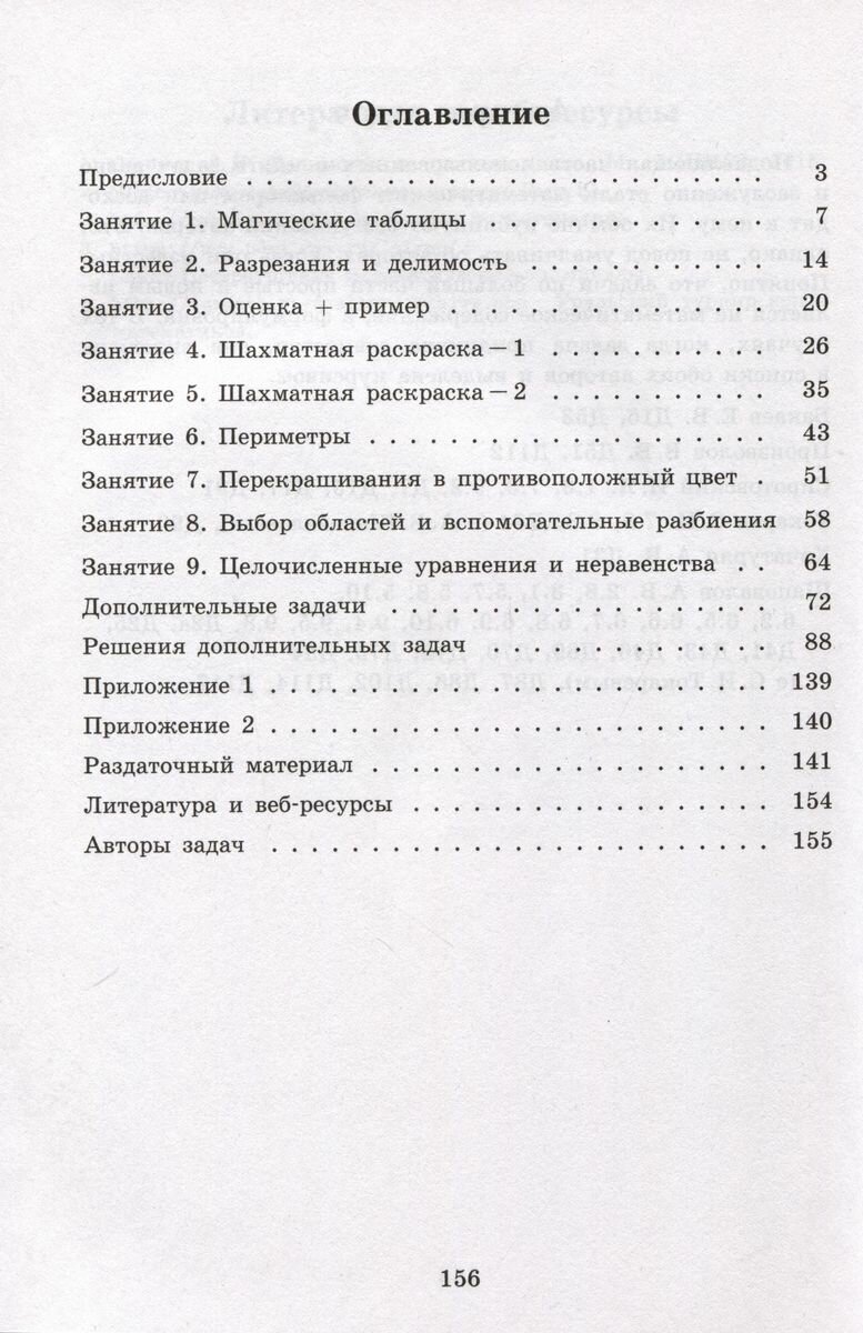В неё вошли разработки девяти занятий математического кружка с подробно разобранными примерами различной сложности, задачами для самостоятельного решения и методическими указаниями для преподавателя. Все задачи приведены с подробными решениями. Разбираются задачи, связанные с подсчётом двумя способами одной и той же величины, уравнениями в целых числах, чередованием и шахматной раскраской, чётностью и делимостью, выделением областей.