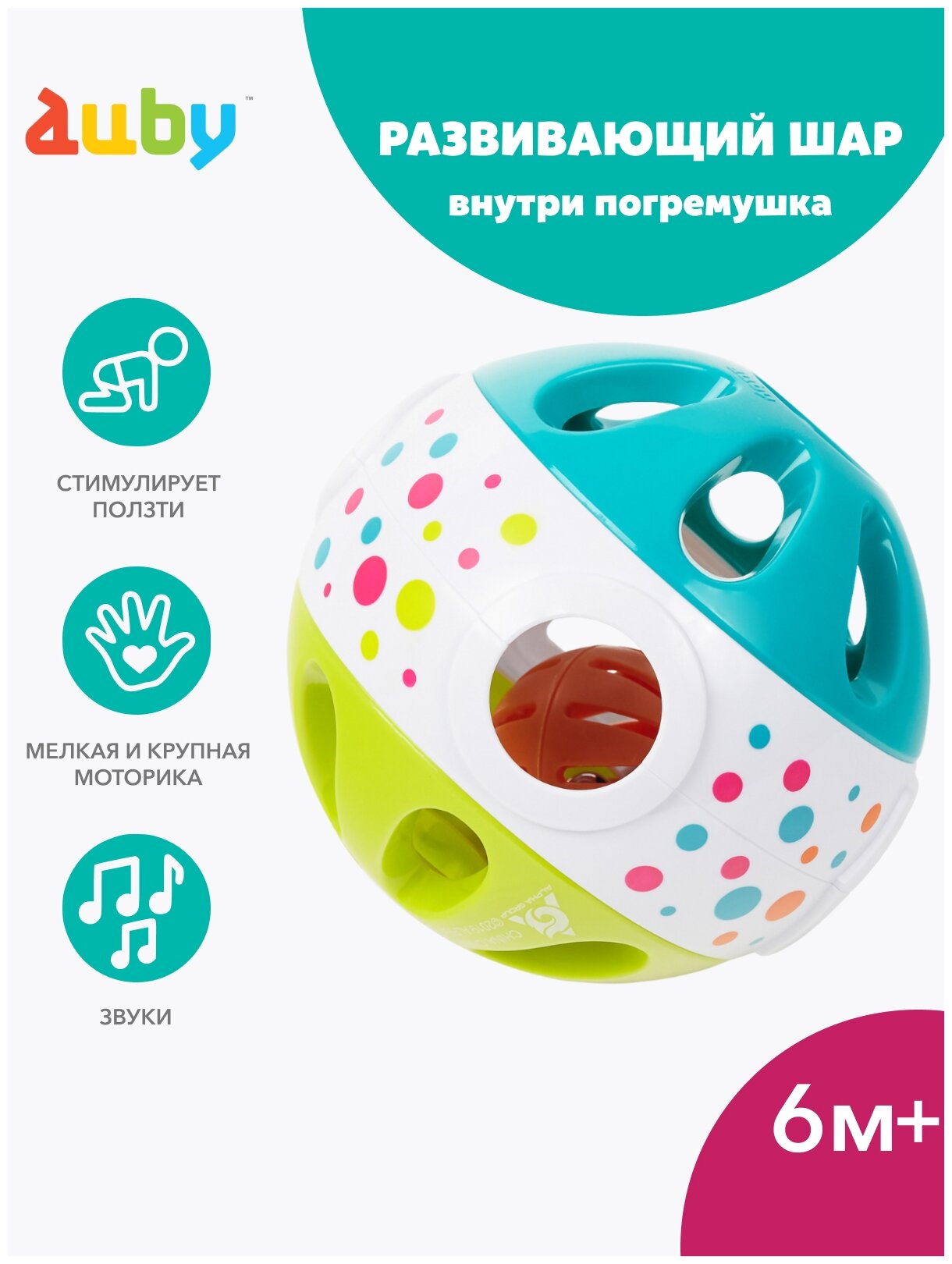 Мы - Аuby! Многофункциональные, интерактивные и развивающие игрушки для малышей. Нас создали для того, чтобы быть рядом с вашим ребенком с самого рождения и помогать вам в его развитии на каждом этапе.Я - Развивающий Шар 2-в-1 от Ауби! Меня можно кидать, пинать и ловить. Со мной ваш ребенок будет учится чувствовать пространство, расстояние и скорость. Способствую развитию мелкой и крупной моторики, восприятия звуков и вообще со мной весело проводить время!В чем особенность развивающего шара от Ауби?- гарантия безопасности и качества материалов- игрушку легко держать маленькой детской ручкой- отверстия для пальцев разных форм, формирующие понятия о фигурах: круг, овал, квадрат, треугольник- внутри шара есть погремушка, которая приятно звенить при движенииИграй, расти и развивайся с Ауби!Для малышей от 6 месяцев. Тип упаковки – подвес. Диаметр игрушки: 13 см.Изготовлено из высококачественного материала, безопасного для детей.Товар сертифицирован.