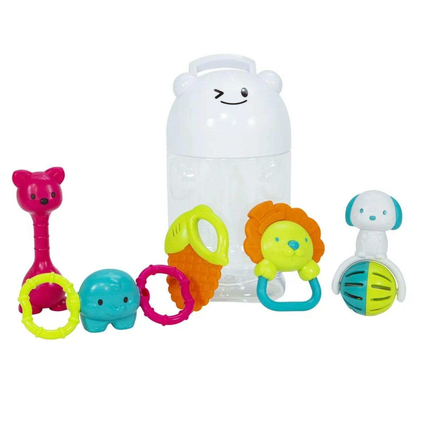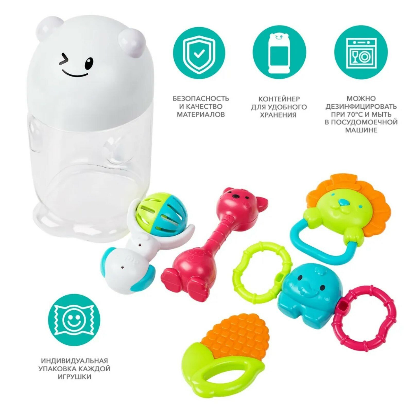 Мы - Аuby! Многофункциональные, интерактивные и развивающие игрушки для малышей. Нас создали для того, чтобы быть рядом с вашим ребенком с самого рождения и помогать вам в его развитии на каждом этапе.Я - набор погремушек и прорезывателей 5-в-1 от Ауби. Незаменимый помощник мамы и первый друг малыша!В моем наборе 5 погремушек и прорезывателей. Они способствуют первому познанию мира, развивают зрительное, слуховое и тактильное восприятие, помогают успокоить малыша и облегчить зуд в деснах.Почему набор погремушек и прорезывателей от Ауби?- гарантия безопасности и качества материалов- контейнер в виде мишки, в котором удобно хранить и брать игрушки с собой - игрушки легко держать маленькой детской ручкой- можно дезинфицировать при 70 градусов и мыть в посудомоечной машине- разнообразие форм для развития мелкой моторикиИграй, расти и развивайся с Ауби!Для малышей от 3 месяцев. Каждая игрушка индивидуально упакована в пакет для хранения.Размер набора: 22*12*12 см. Изготовлено из высококачественного материала, безопасного для детей. Товар сертифицирован.