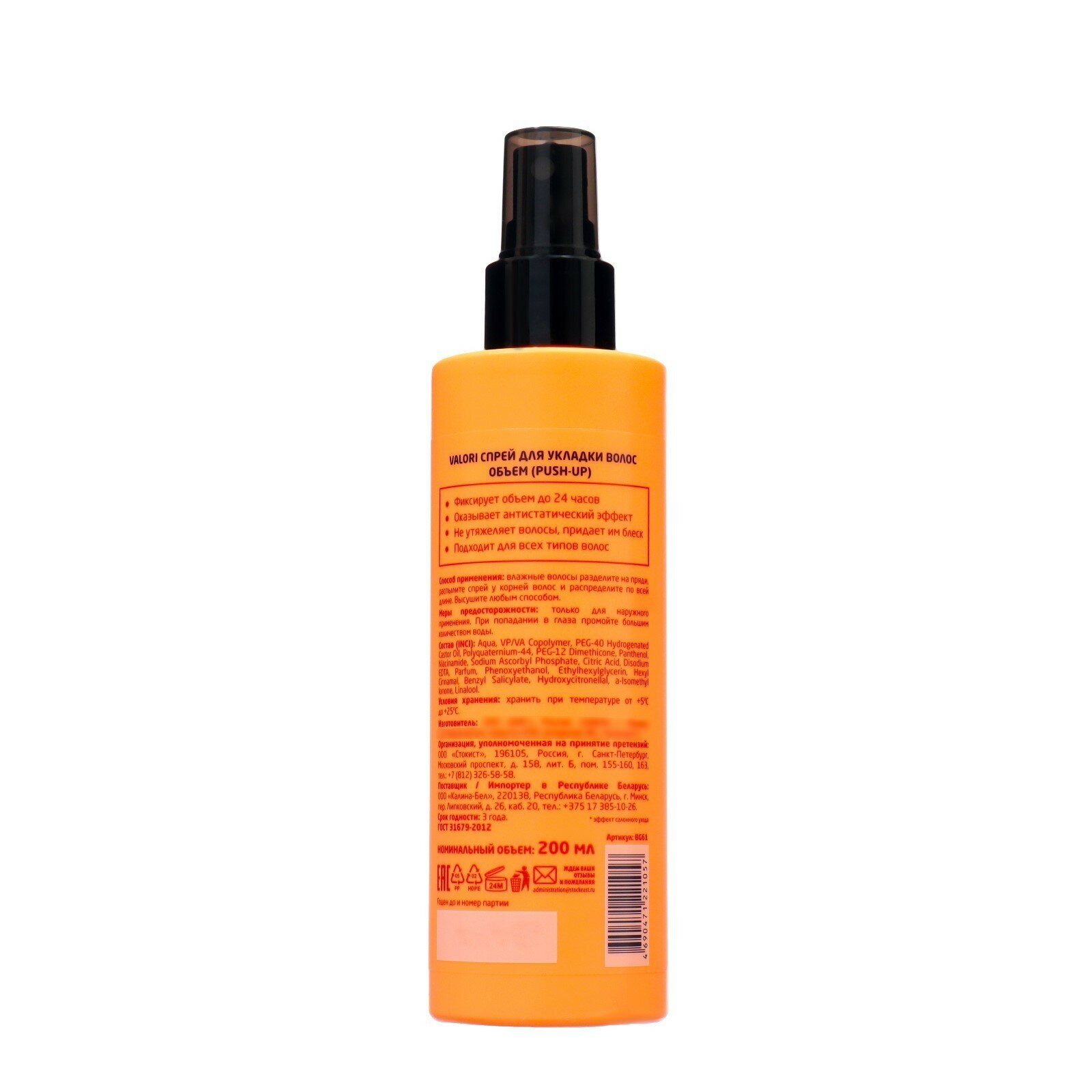 | Способ применения | для придания объема распылить лосьон-спрей у корней влажных волос. Оставить до полного высыхания или высушить феном. |