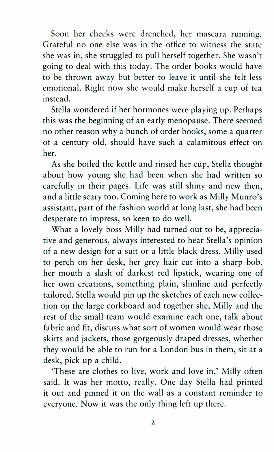 Stella has life under control - and that's the way she likes it. For twenty-five years, she's been trusted assistant to a legendary fashion designer but after her boss dies suddenly, she's left with nothing to do apart from clear the studio.