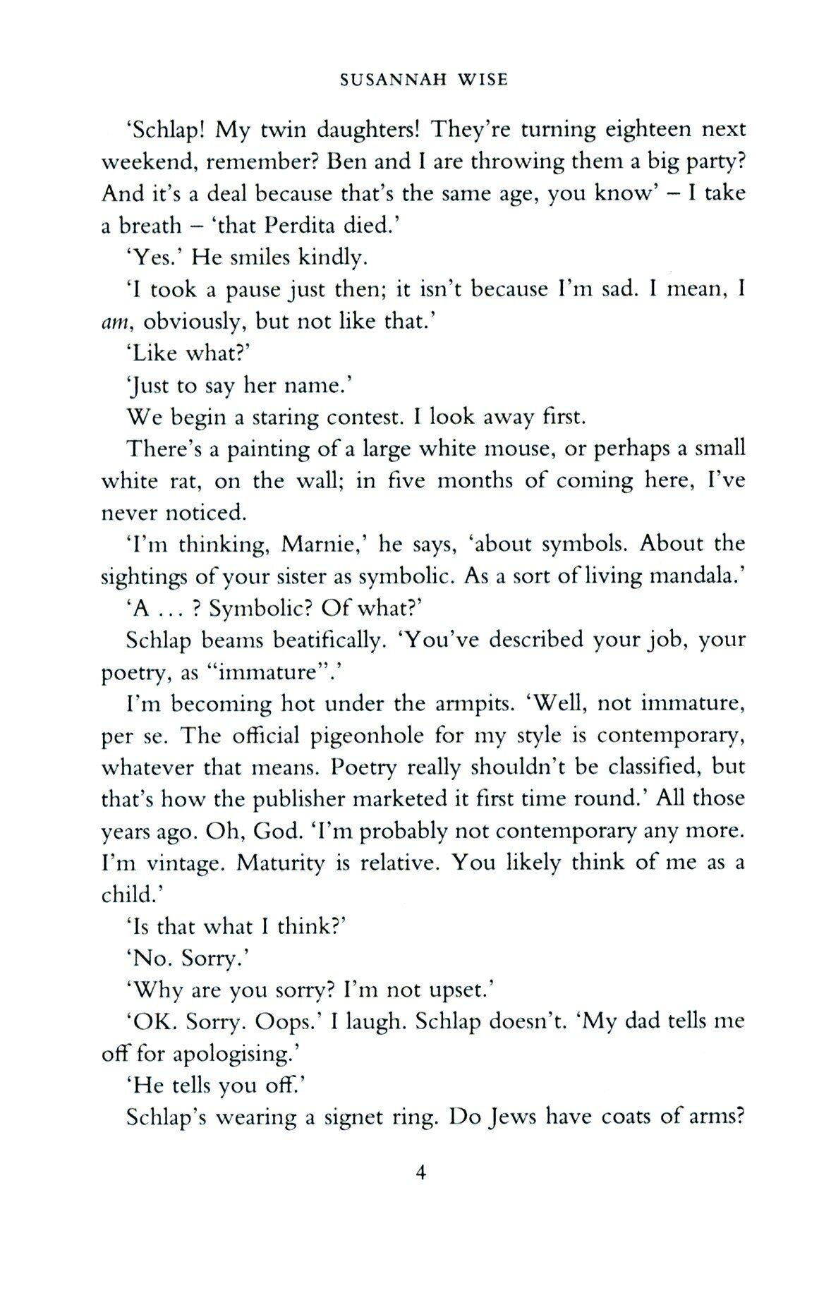 For several months Marnie, a middle-aged poet and mother, has experienced sightings of her long-dead identical twin sister, Perdita, across London. As a consequence, and due to her crippling writer's block, she has sought the help of octogenarian Harley Street shrink, Schlap, to work through her problems. Not least her repeated dreams of being a man.