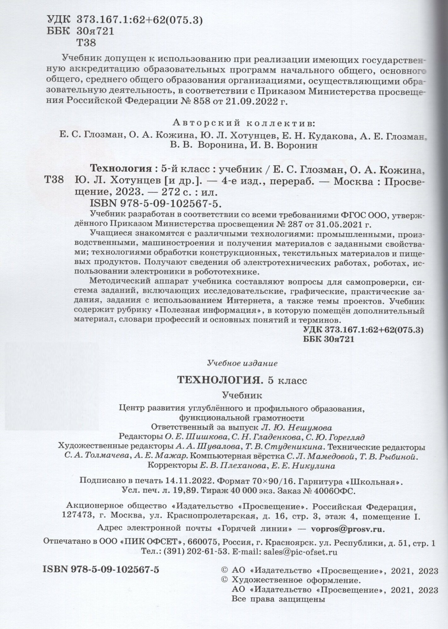Технология. 5 класс. Учебник. ФГОС (Евгений Самуилович Глозман, Ольга Алексеевна Кожина, Юрий Леонтьевич Хотунцев); Просвещение, 2025